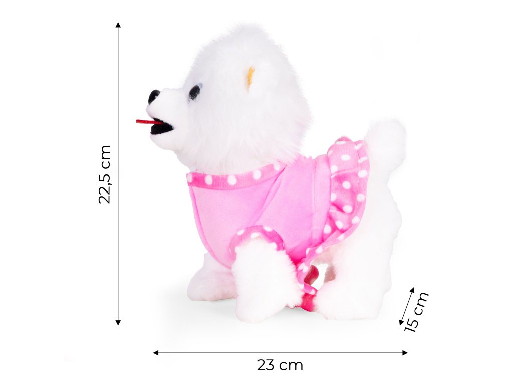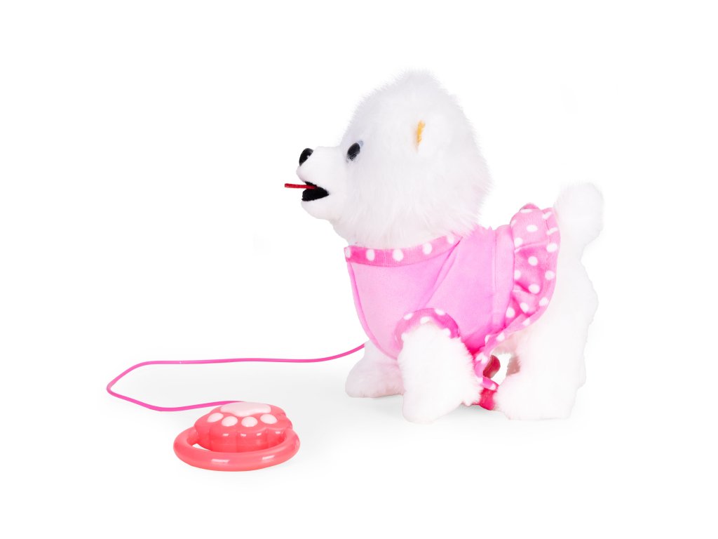 - Interaktívny pes reaguje na stlačenie tlačidla na vodítku - chodí, vrtí chvostom, hýbe hlavou a hrá sa viac ako 20 melódií. Vďaka realistickým pohybom má dieťa dojem kontaktu so skutočným zvieraťom, čo prehlbuje jeho zaangažovanosť a robí hru vzrušujúcejšou.