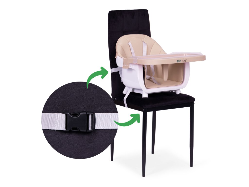 Táto praktická stolička sa dása dá ľahko pripojiť k štandardnej stoličke,dieťa tak má pri stole svoj vlastný bezpečný priestor. Po odstránení nôh, sedadlo možno ľahko pripevniť k akémukoľvek typu stoličky v domácnosti a priložené popruhy ho ďalej upevňujú a stabilizujú. Takéto riešenie v ideálnom prípadesa osvedčí na rodinných výletoch a cestách.
