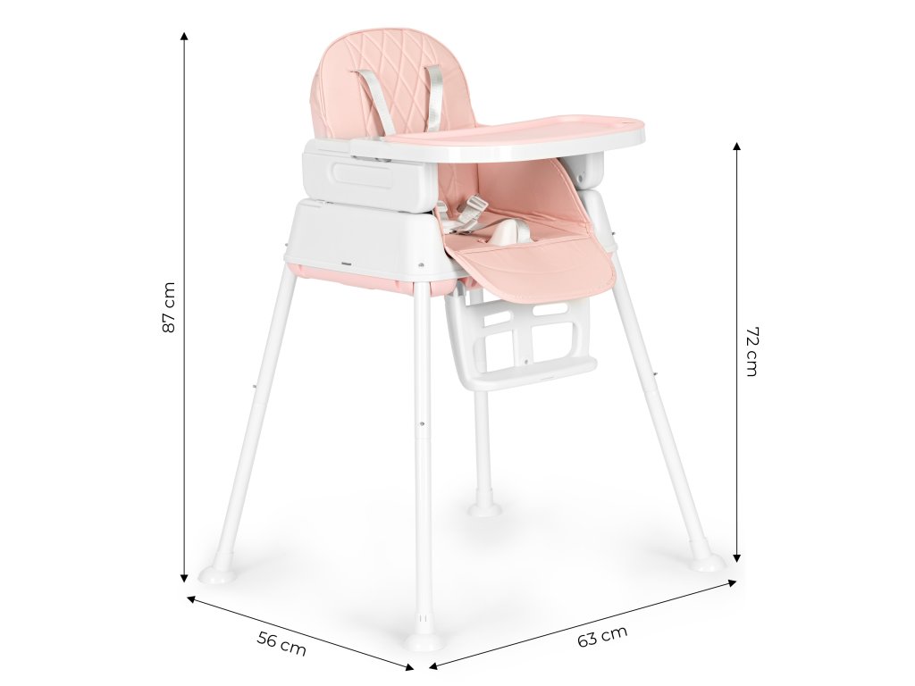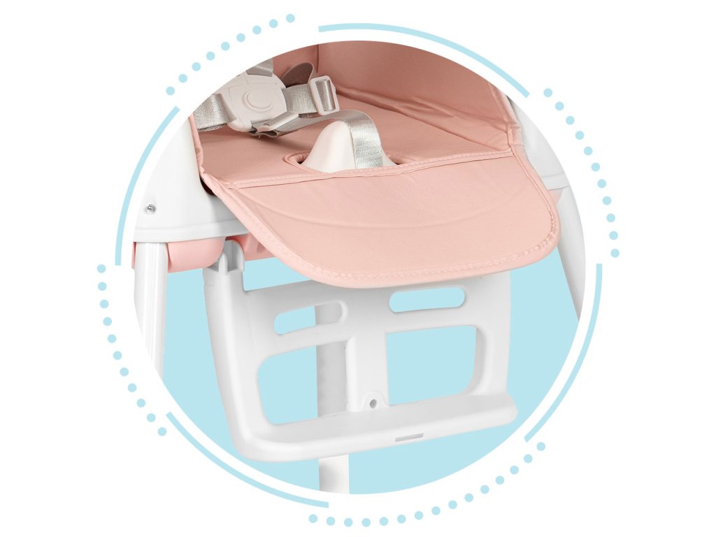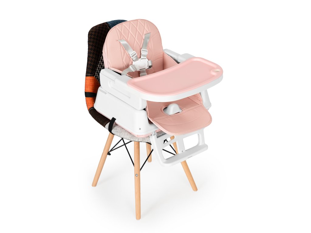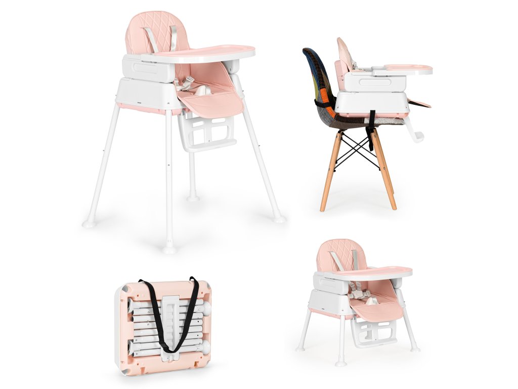 Stolička má nastaviteľná výška. Nohy a opierku nôh môžete ľahko odstrániť, takže vysoká stolička sa zmení na nižšiu stoličku. Jedinečnou vlastnosťou stoličky je jej sedadlo, ktoré môžete používať tak, že ho umiestnite na stoličku v jedálni alebo v kuchyni. Súprava obsahuje špeciálne upevňovacie pásky na sedadlo a operadlo tradičnej stoličky.