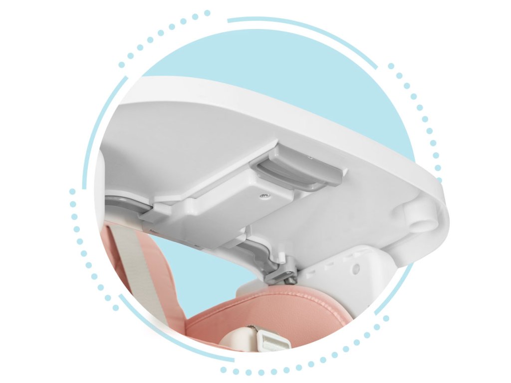 Zásobník má nastavenie vzdialenosti voči operadlu, stačí použiť páčku na jeho spodnej strane a posunúť ju. Jeho výhody sú dve vrstvy a profilované hrany ktoré zabránia pádu pokrmu na zem.