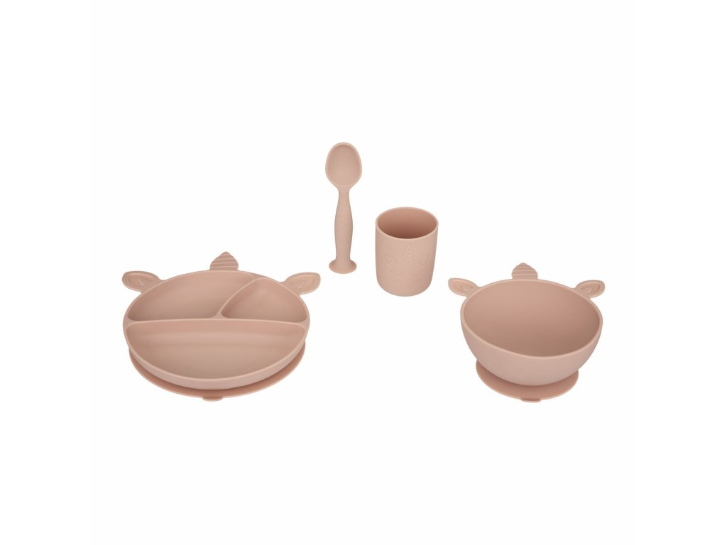 súprava Táto súprava jedál "Unicorn" je celá vyrobená zo silikónu a skladá sa z taniera, misky, šálky a lyžice. Ideálny na prvé jedlo, doma alebo na cestách, je veľmi stabilný. Lyžica stojí vzpriamene a riad má protišmykové podpery.