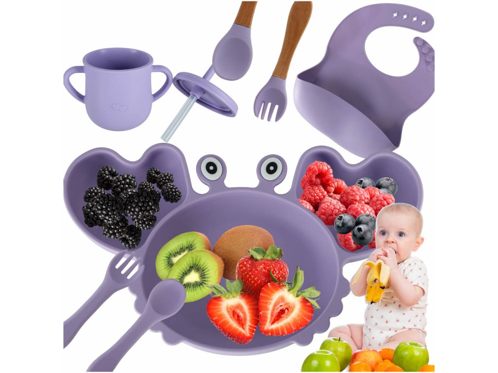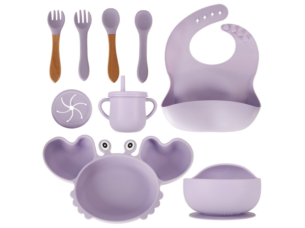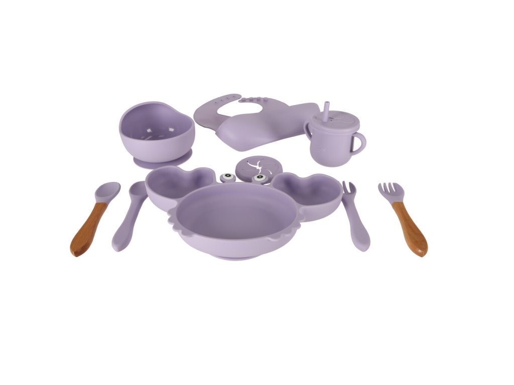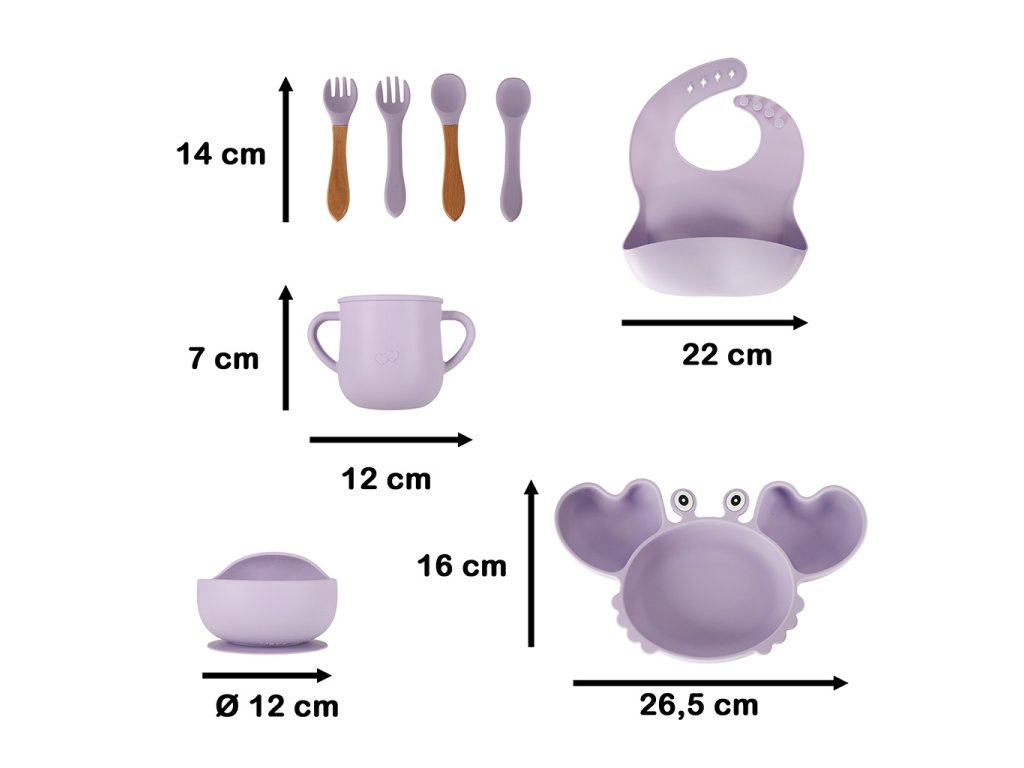 Súprava obsahuje všetko potrebné príslušenstvo, ako je tanier v tvare kraba, miska s krytom, ktorý zabraňuje rozsypaniu a vyliatiu jedla, pohár s dvoma viečkami (vrátane jedného so slamkou), príbor (niektoré s drevenými časťami) a podbradník. S touto súpravou bude vaše dieťatko pripravené na každé jedlo!