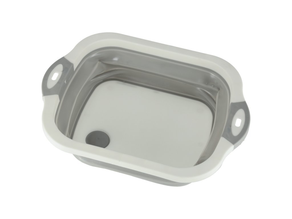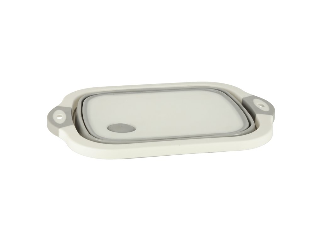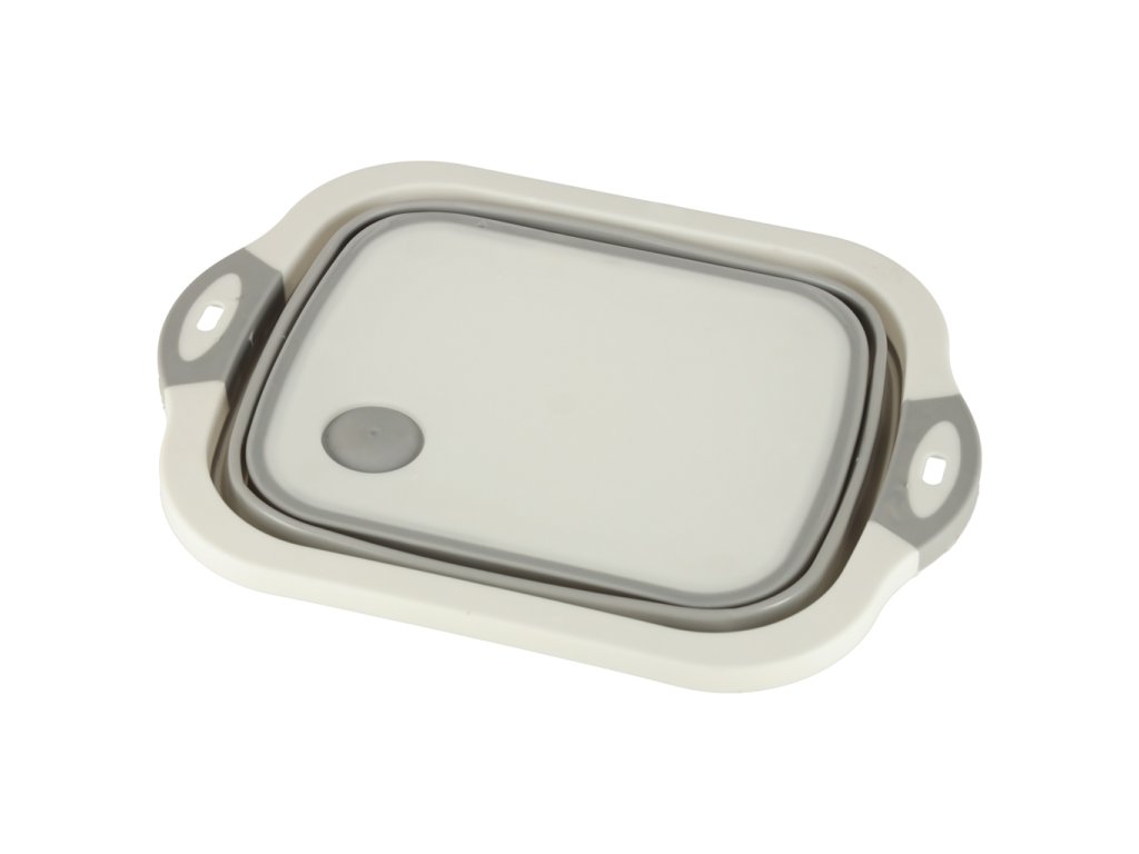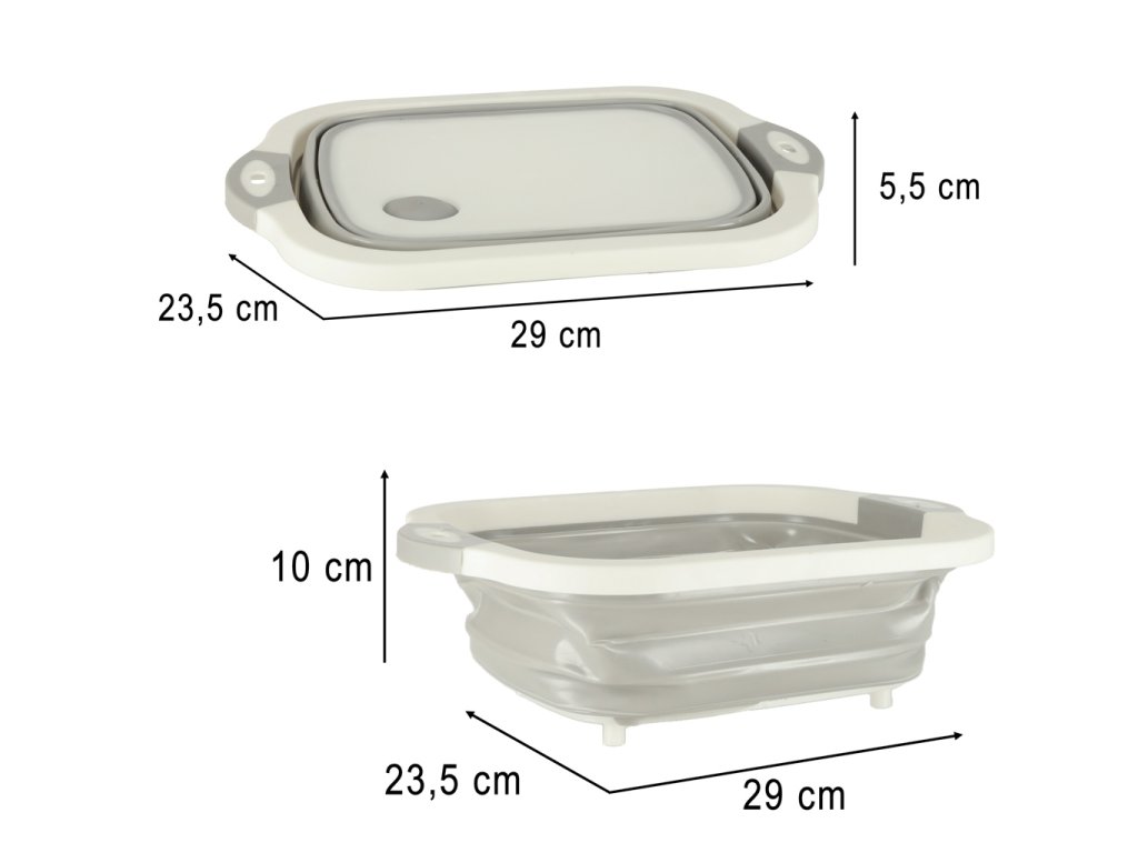● Farba: bielo-šedá ● Materiál: pružný silikón + plast ● Objem: 5,5 l ● Plocha dosky: 25,5 × 20 cm ● Rozmery v zloženom stave: Rozmery: 37 × 27 × 2,5 cm ● Rozložené rozmery: 37 × 27 × 6,8 - 12 cm ● Výška misky: 29 × 23,5 × 10 cm a 29 × 23,5 × 5,5 cm ● Silikónová zátka na odtok vody ● Pohodlné držadlá na prenášanie ● Balenie: fólia (37 × 27 × 2,5 cm)