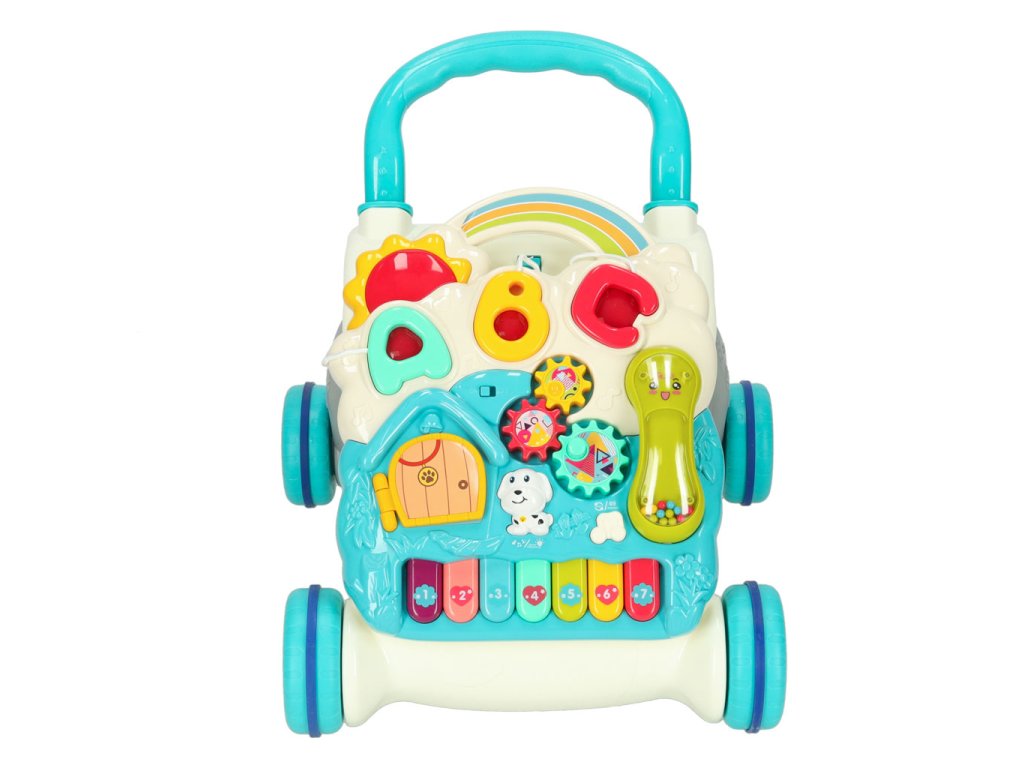 štyri produkty v jednom - prvky súpravy sa dajú vymeniť, čím sa výrobok zmení na hraciu tabuľu, vzdelávací stôl alebo praktické chodítko pre deti