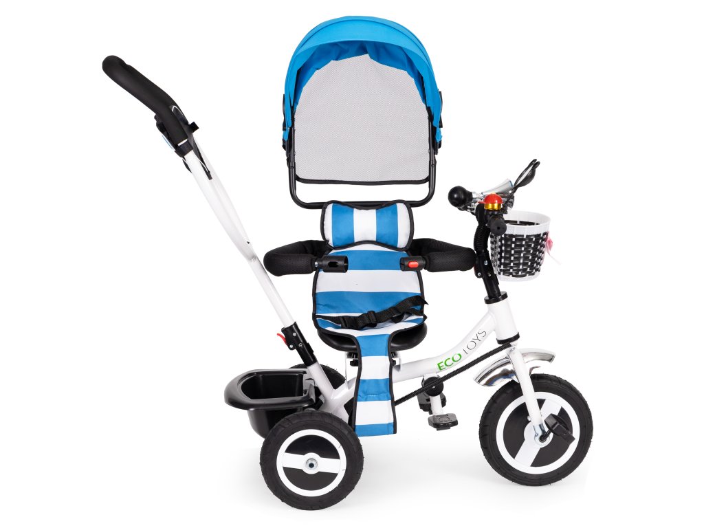 Bicykel ECOTOYS v sebe spája množstvo praktických funkcií, ktoré zabezpečia, aby vaše dieťapohodlná a bezpečná hra. Bicykel mámäkké, pohodlné operadloktorá umožňuje batoľaťu pohodlne sedieť abezpečnostné pásy a zábrany proti vypadnutiu zo sedadla.Skladacia strieška chráni pred dažďom a slnkom. Špeciálne tvarovaný rám aotočné sedadlo uľahčí nástup najmenším deťom.