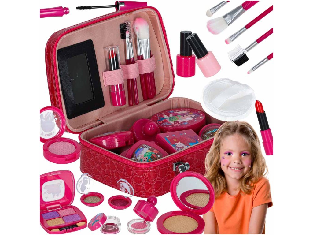 Roztomilý kozmetický kufor pre deti 3+ je bezpečná sada na kreatívnu hru s líčením. Všetky predmety sú imitáciou skutočnej kozmetiky - tiene a púdre sú vyrobené z farebnej peny a maskara je vnútri dutá. Kufrík je vyrobený z elegantného materiálu imitujúceho kožu pre štýlový vzhľad. Má praktickú rukoväť na prenášanie, dva zámky na jednoduché otváranie a štyri kovové nožičky, ktoré zabezpečia, že bude pevne stáť na akomkoľvek povrchu. Súprava rozvíja predstavivosť a umožňuje dieťaťu hrať sa bez rizika zašpinenia.