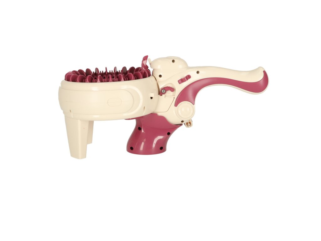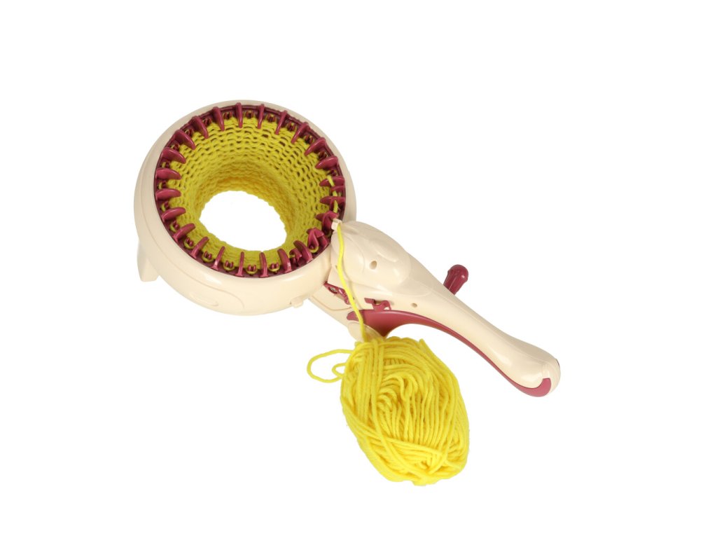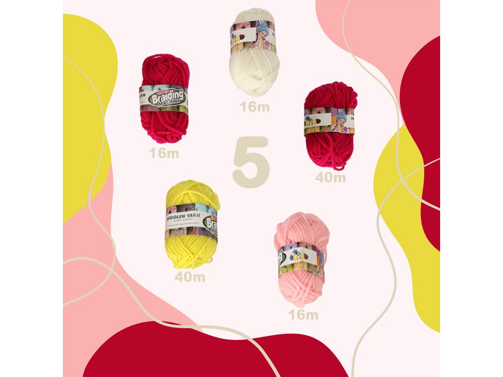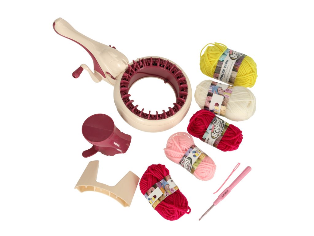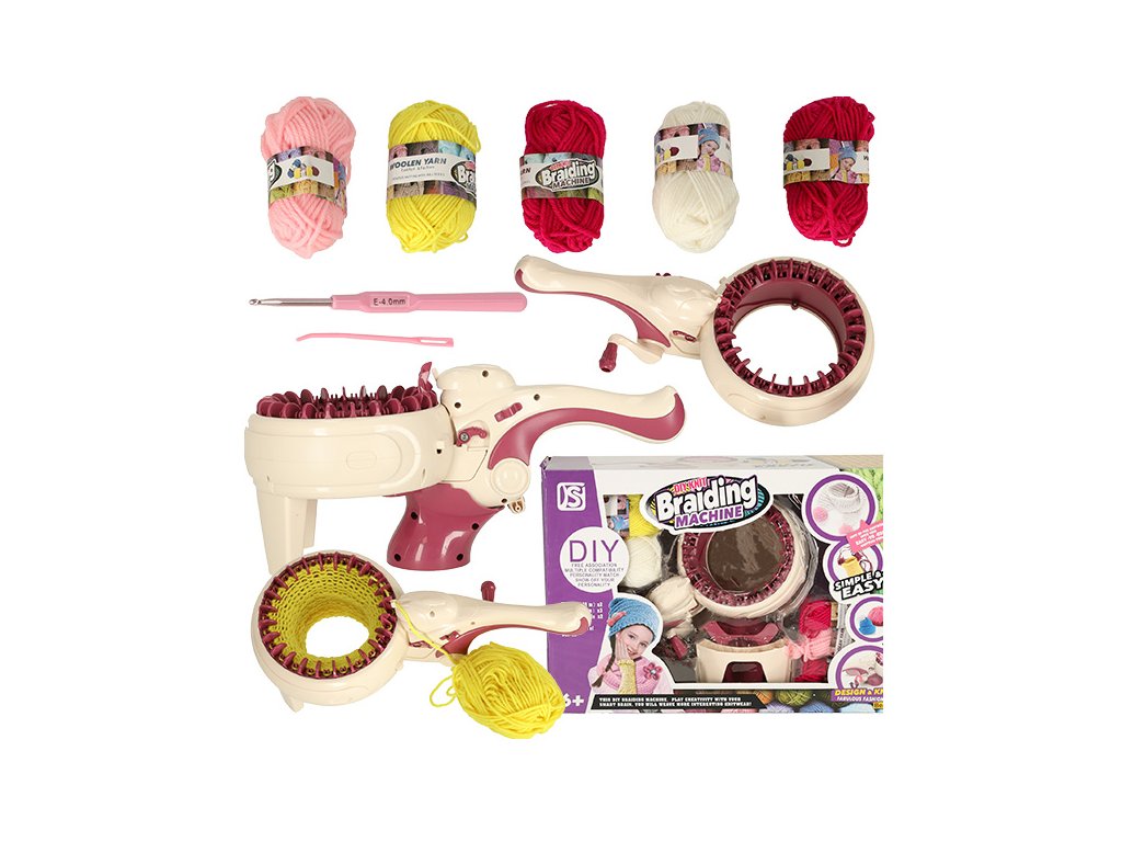 Okrem stroja je súčasťou balenia aj ďalšie nevyhnutné príslušenstvo - priadza v 5 farbách (modrá, biela, žltá, svetloružová a tmavoružová), háčik na háčkovanie a plastová ihla s veľkým očkom! Takže v skratke - kompletná súprava na pletenie!