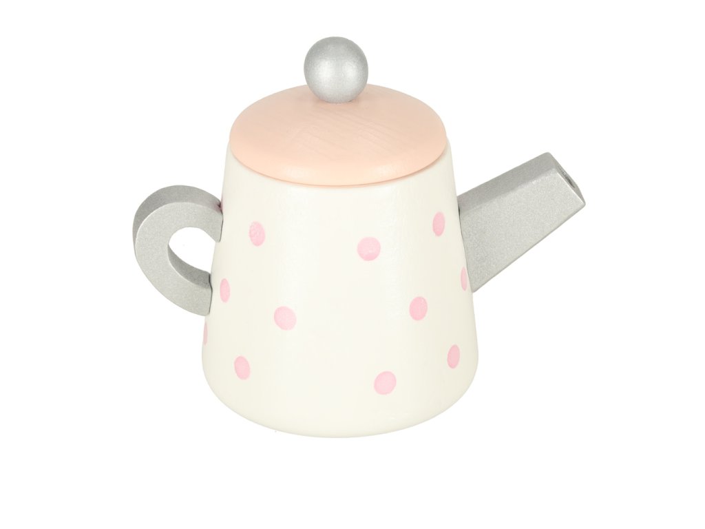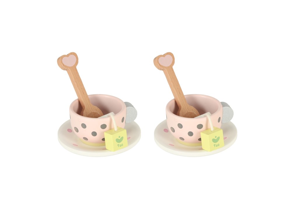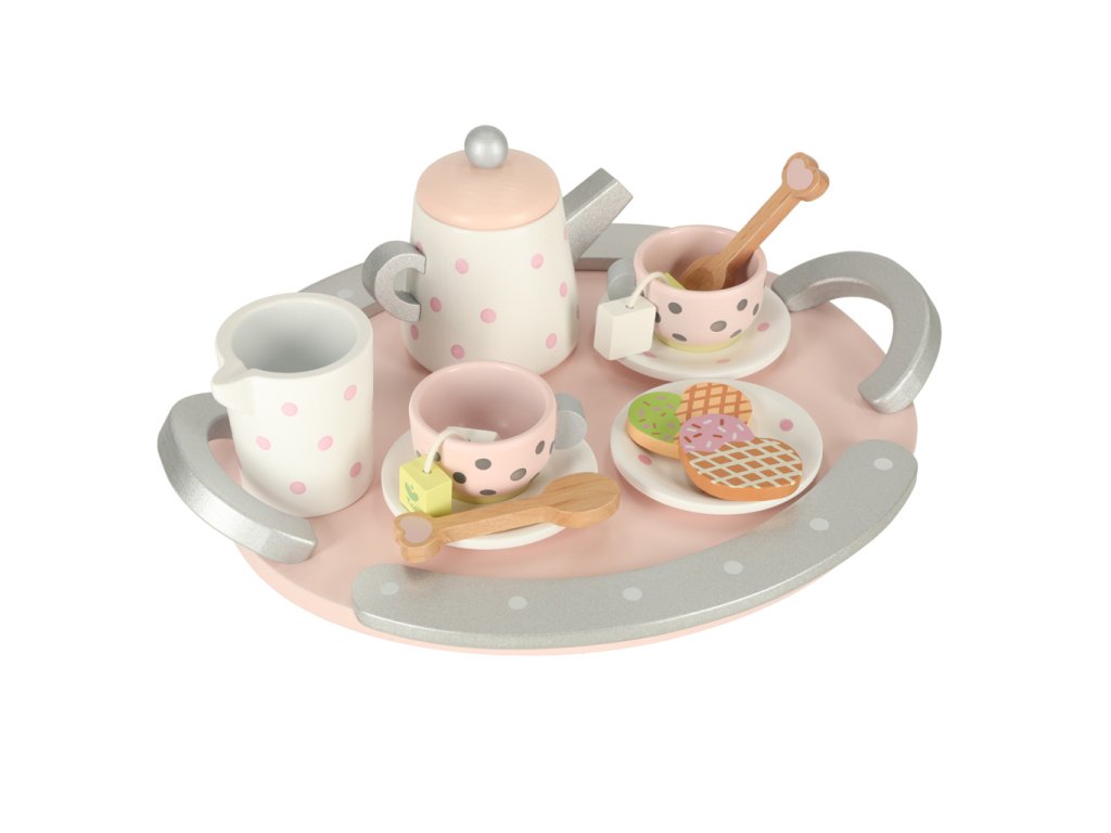 - veľký počet prvkov - Súprava obsahuje šálky, taniere, kanvicu, kanvicu na mlieko, lyžičky, čajové vrecúška a sušienky - všetko, čo potrebujete na malú párty