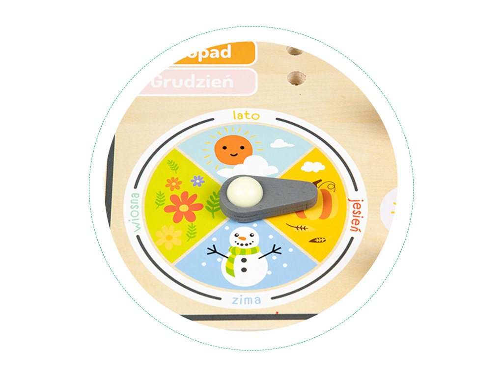 - Učenie sa o ročných obdobiach - v dolnom rohu sa nachádza ciferník s otočným ukazovateľom, ktorý označuje ročné obdobia. Dieťa bude mať možnosť spoznať jednotlivé ročné obdobia a ich poradie.