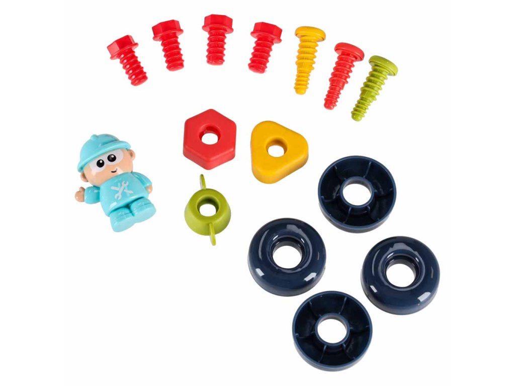 - Autobus so sedadlom vodiča- Postavička vodiča- Sada 4 koliesok- 3 tvary skrutiek (trojuholník, mnohouholník, kruh)- 3 ručné skrutky na precvičovanie presnosti- 4 nástroje: 2 skrutkovače, kladivo, kľúč- Obdĺžnikový modul na montáž- Veľká skrutka s rukoväťou- Motorový prvok- 5 montážnych dosiek- 5 prevodov na skrutkovanie- 26 ďalších skrutiek- Návod na použitie