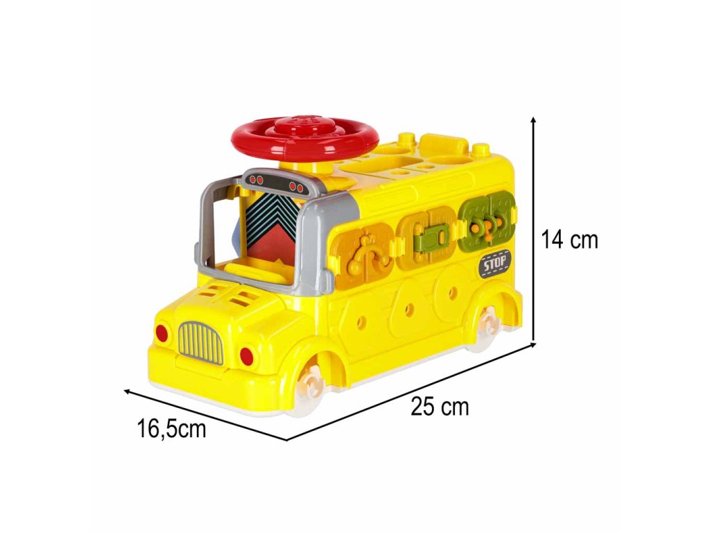 - Určenie: pre deti 3+- Materiál: odolný ABS plast, bezpečný a netoxický- Farebné prevedenie: žltá základňa + rôznofarebné prvky- Napájanie: žiadne - plná manuálna funkčnosť- Rozmeryzbernice: Rozmery autobusu s otvoreným vekom: 25 x 16,5 x 14 cm- Rozmery autobusu s otvoreným vekom: 37 x 16,5 x 14 cm- Hmotnosť hračky: 0,58 kg- Hmotnosť s obalom: 0,75 kg- Balenie: kartón 26 x 17 x 15 cm
