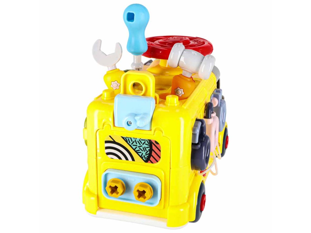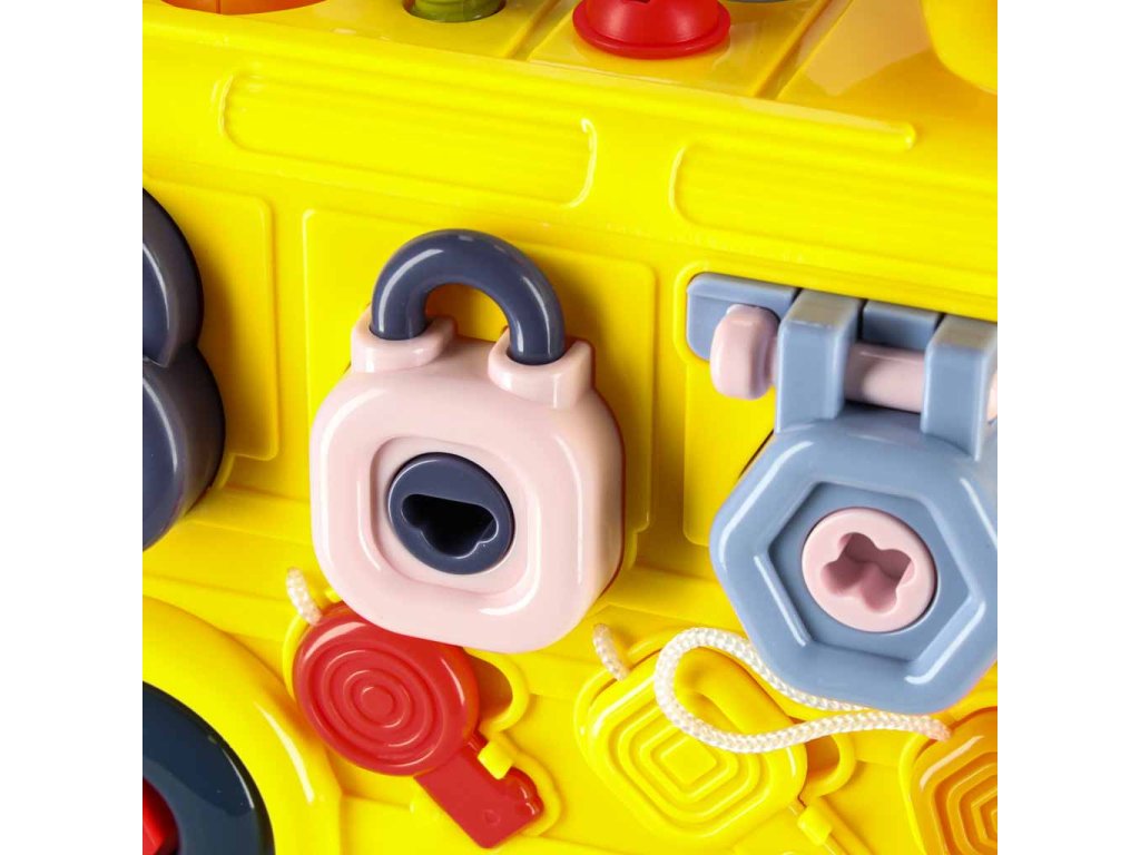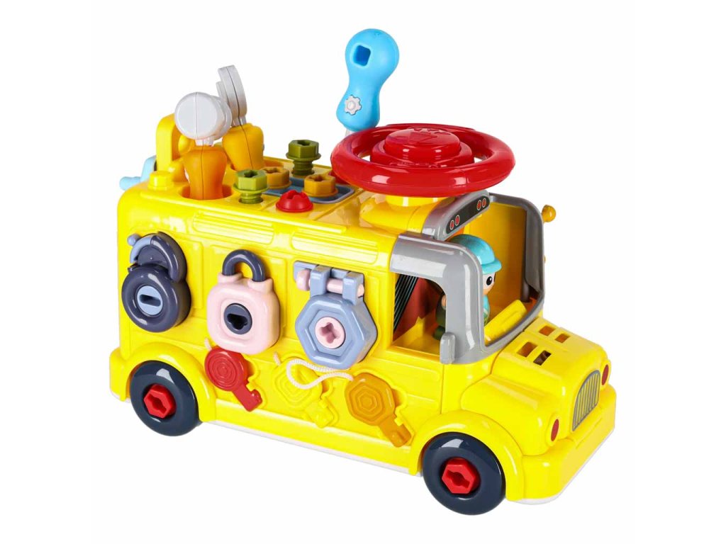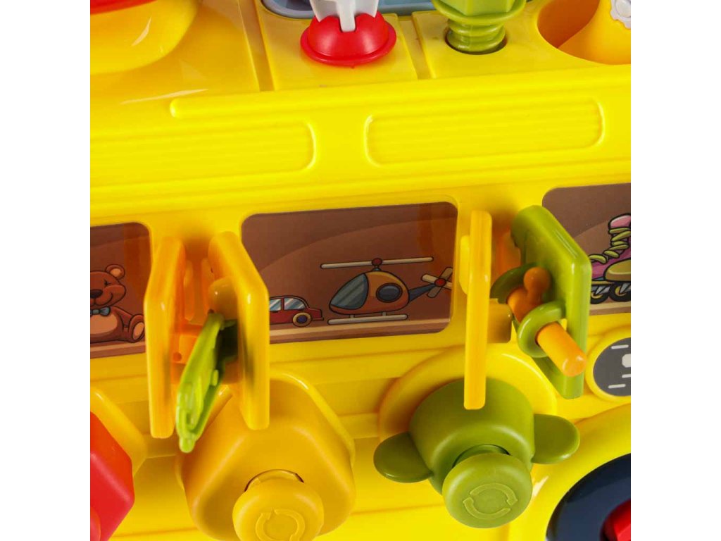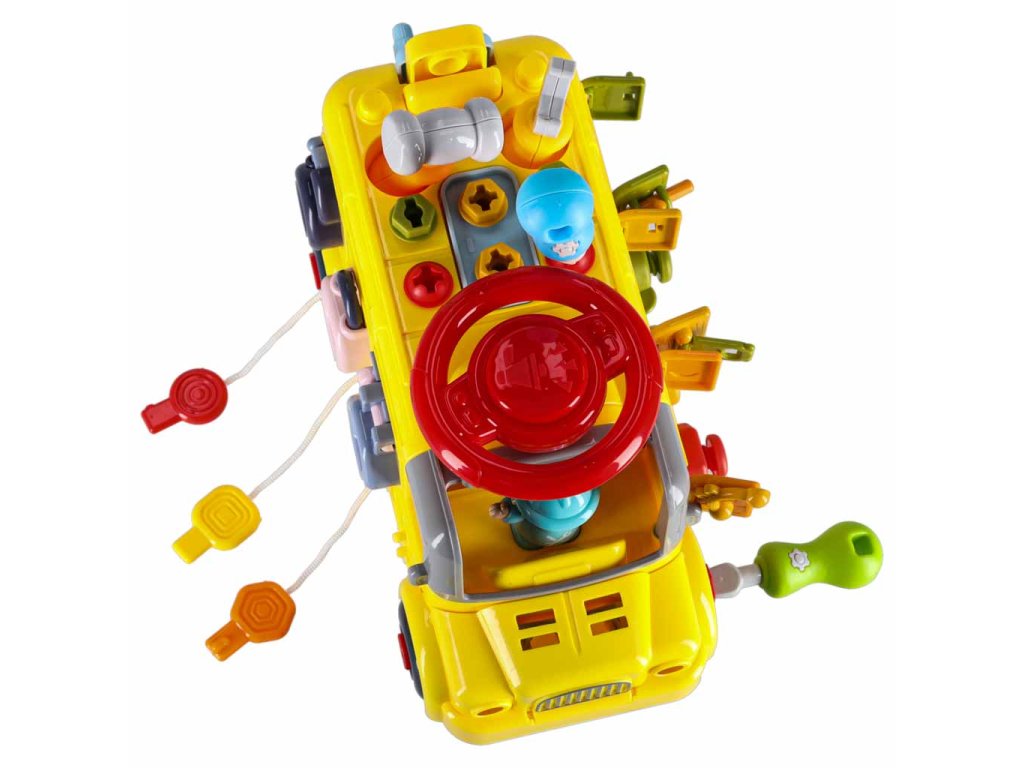 - Jazdiaci autobus s pohyblivými kolesami- Zdvíhanie kapoty "motora"- Otváranie zadných dverí- Otáčanie volantu a klaksónu- 3 okná s rôznym zatváraním- 3 skrutkovacie tvary na precvičovanie presnosti- 3 visiace zámky s kľúčmi na učenie zručnosti