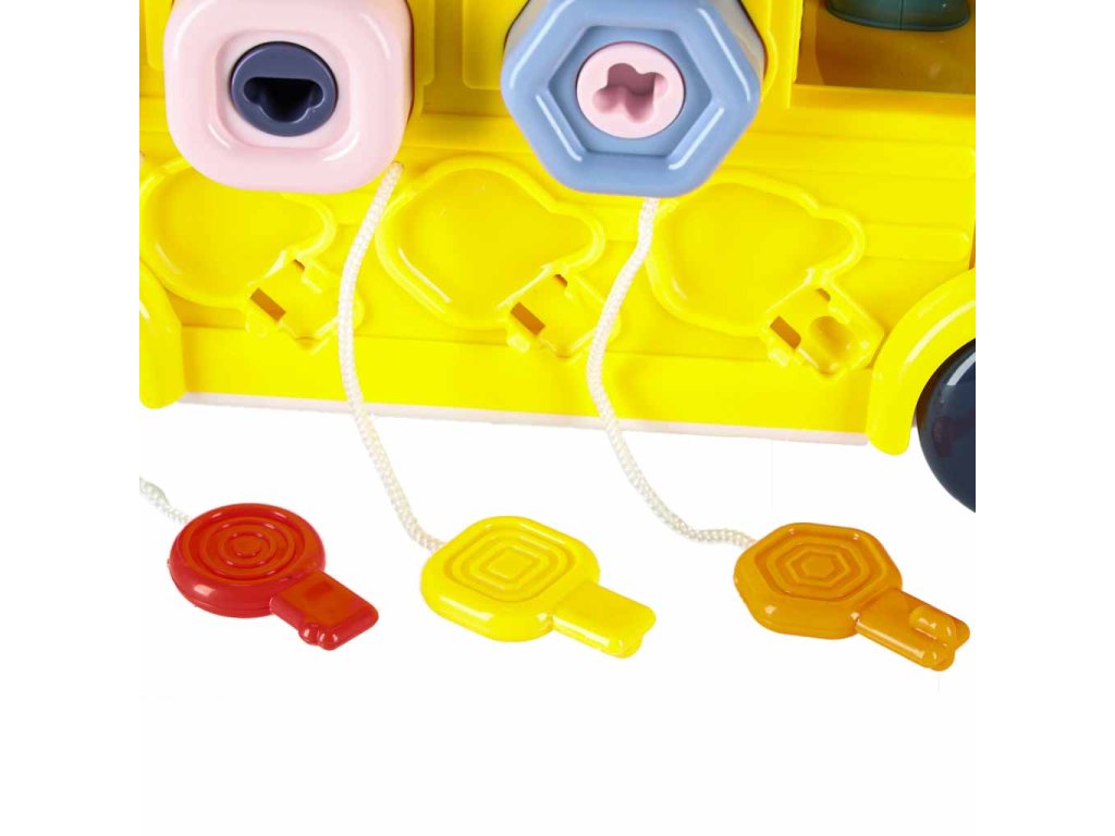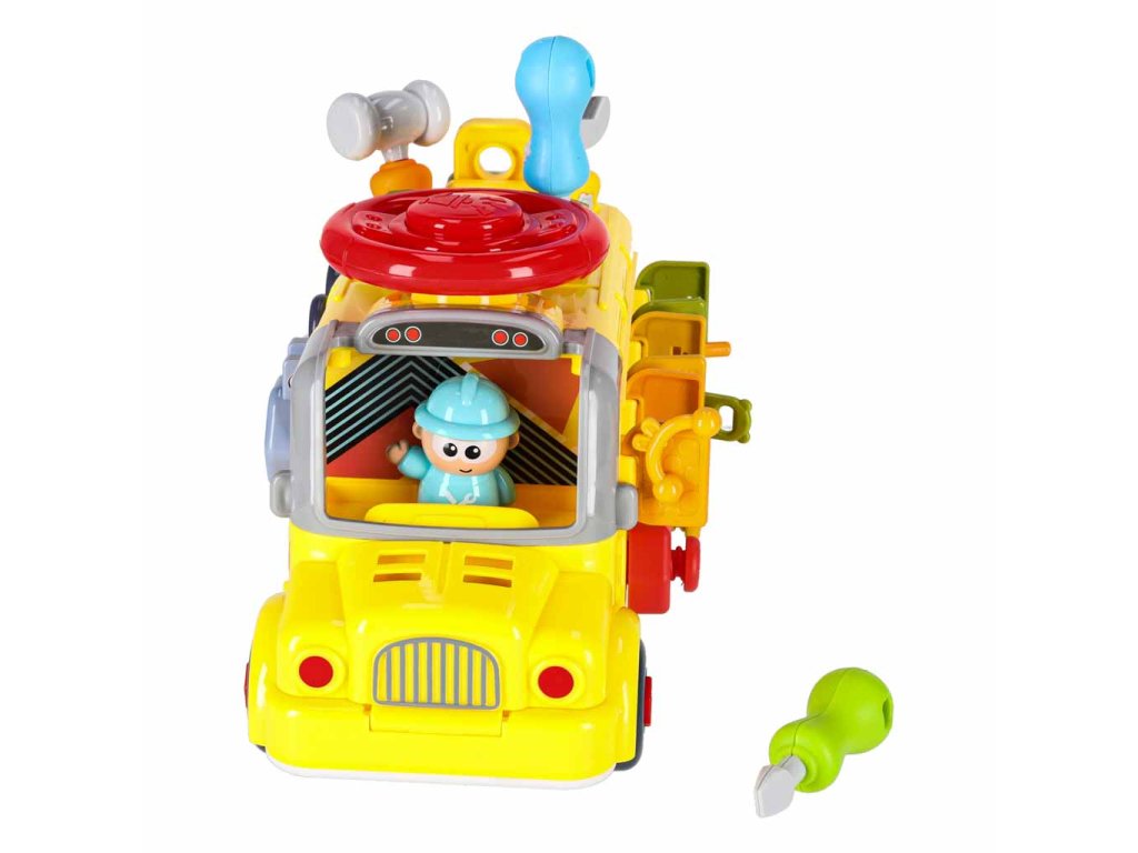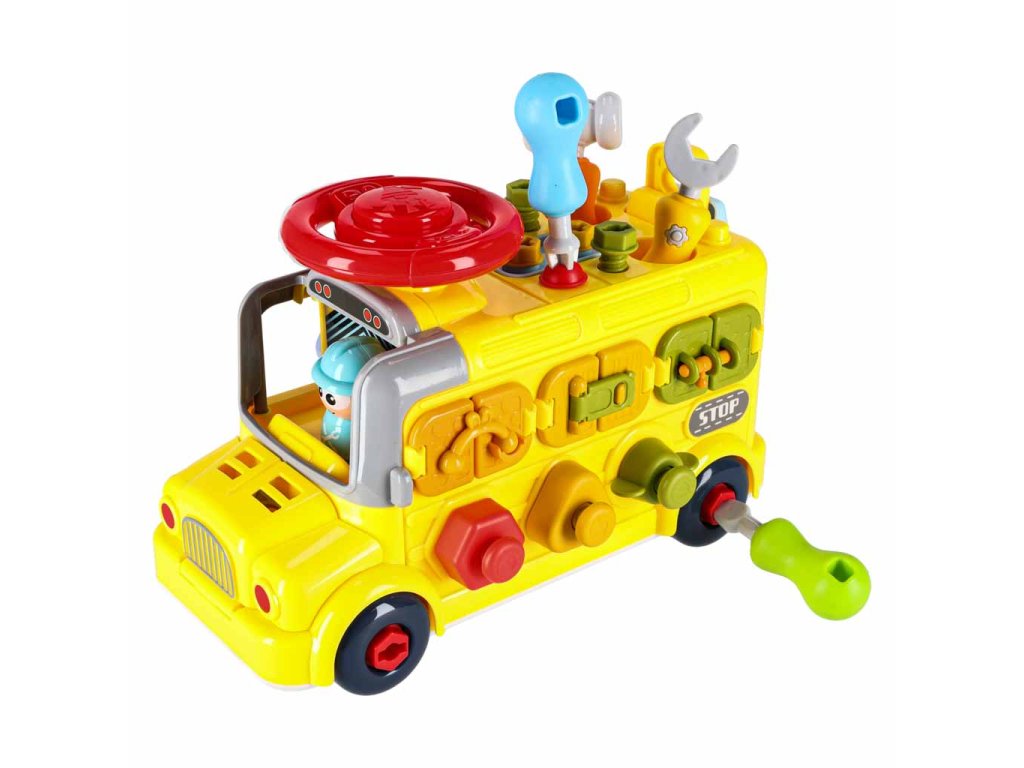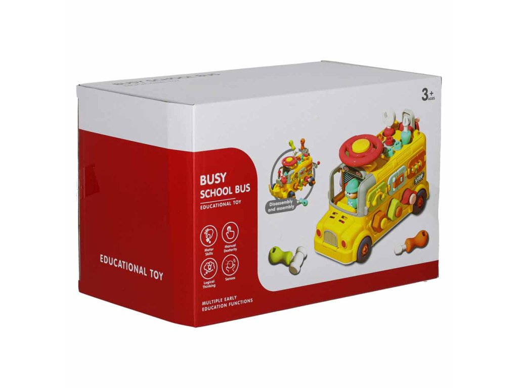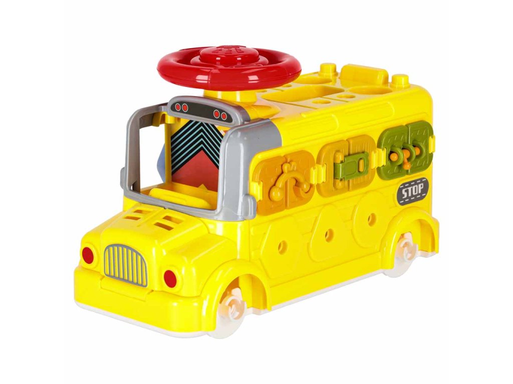 - Jazdiaci autobus s pohyblivými kolesami- Zdvíhanie kapoty "motora"- Otváranie zadných dverí- Otáčanie volantu a klaksónu- 3 okná s rôznym zatváraním- 3 skrutkovacie tvary na precvičovanie presnosti- 3 visiace zámky s kľúčmi na učenie zručnosti