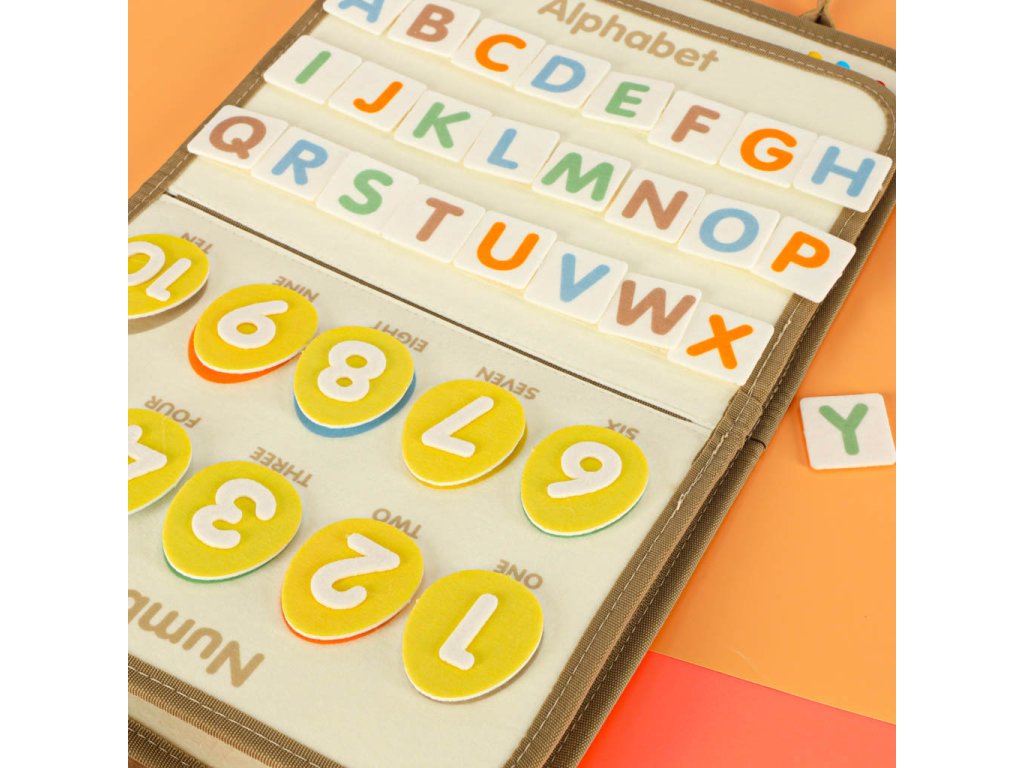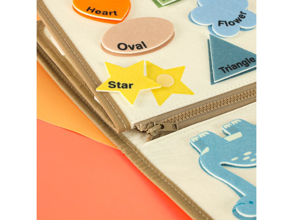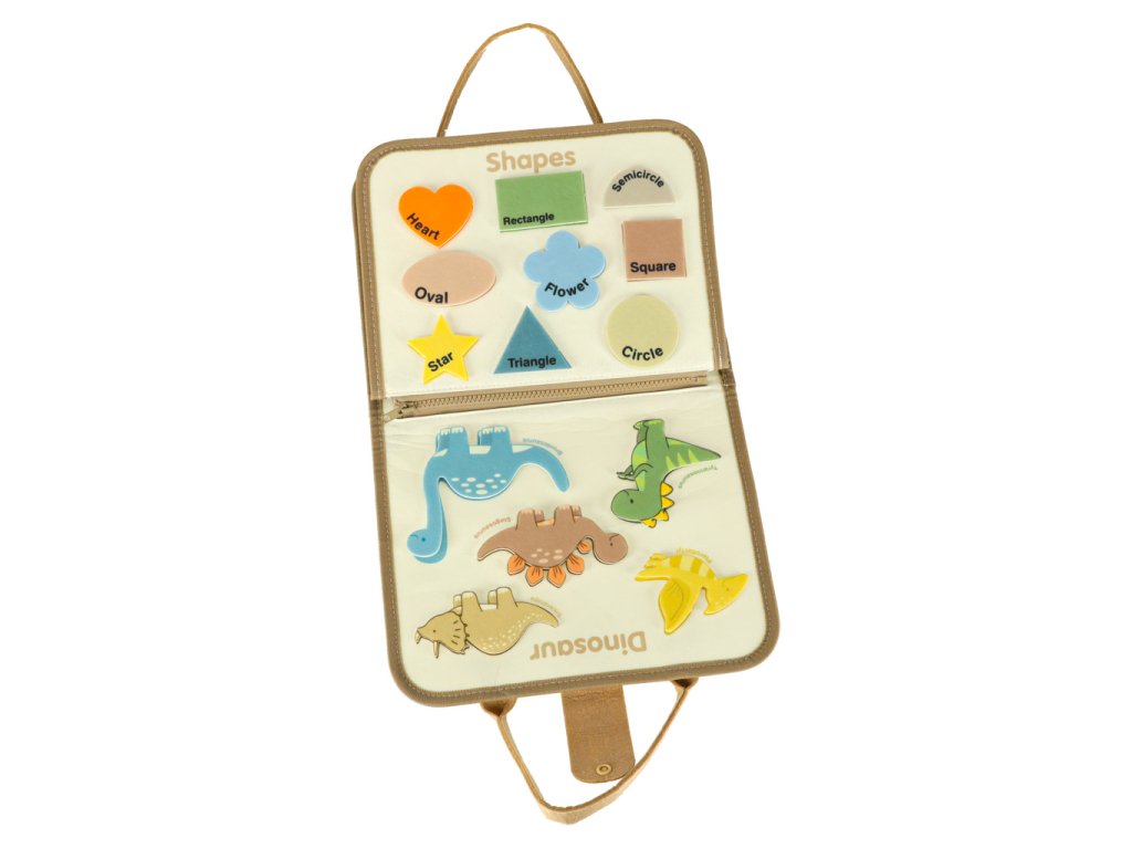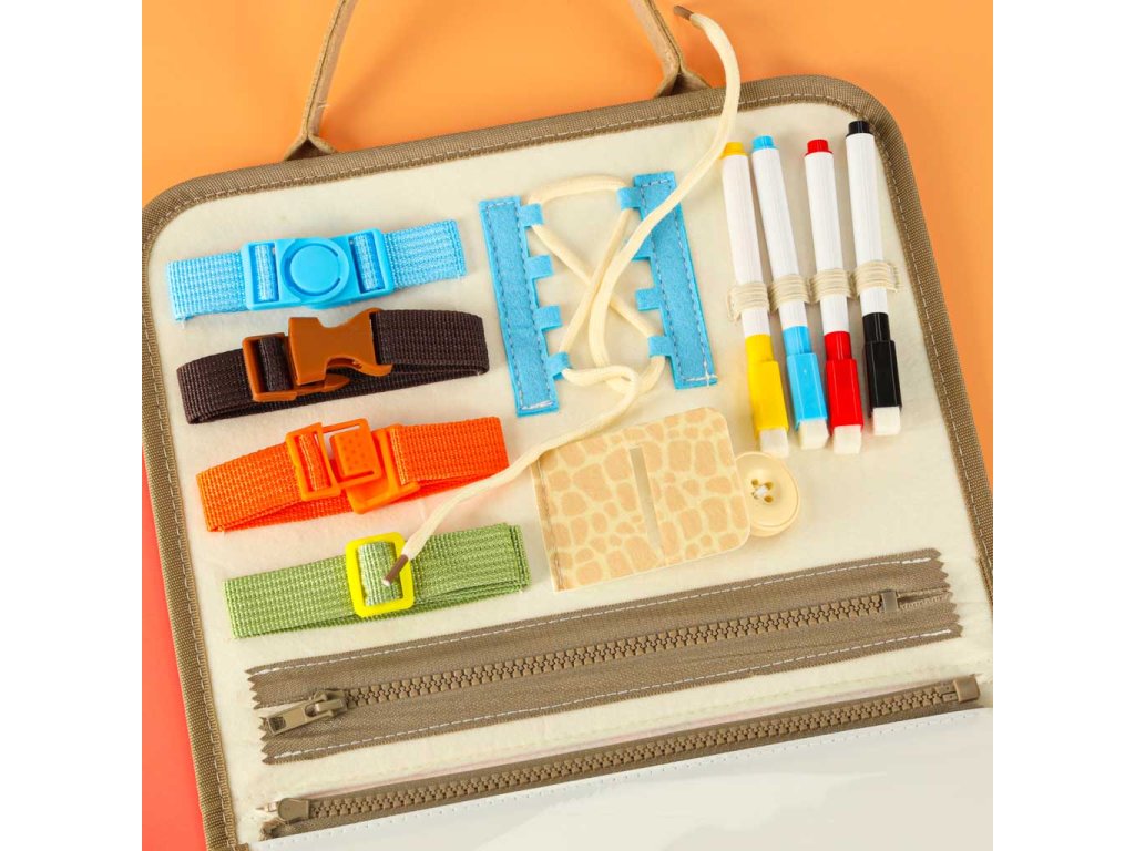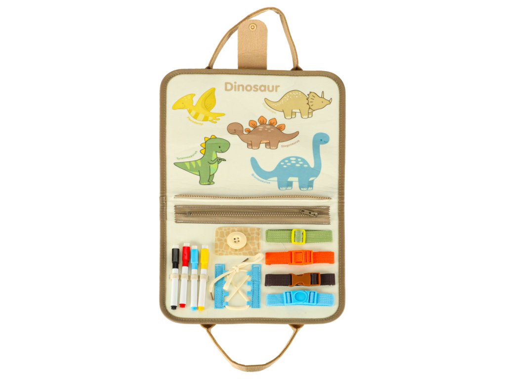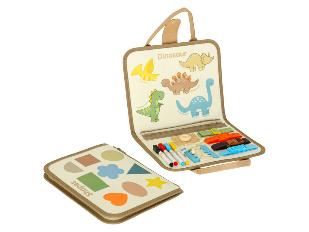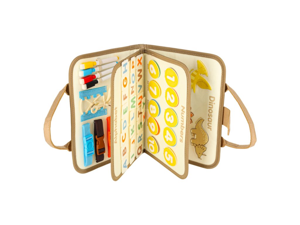 - Motorické prvky: gombíky, zipsy, suché zipsy, pracky, pracky, šnúrky - učia každodenné činnosti a podporujú rozvoj manuálnych schopností- Vzdelávacie prvky: kartičky a tabuľky s písmenami, číslami, farbami, tvarmi a dinosaurami v angličtine - ideálne na učenie hrou- Tvorivé prvky: fixky a suchá mazacia tabuľa umožňujú kreslenie, písanie a mazanie - umelecký rozvoj a tvorivá sloboda