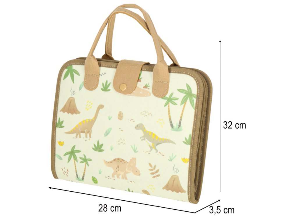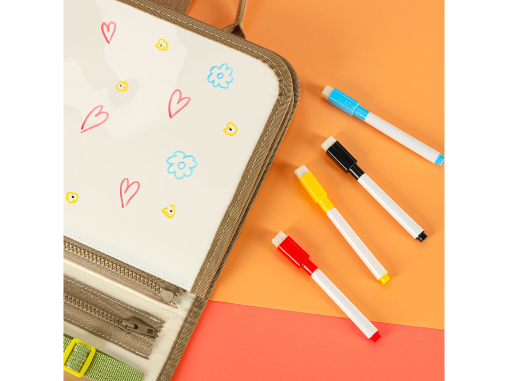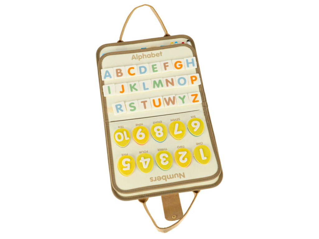 - Praktická manipulačná tabuľa v tvare aktovky- Plstené tvary, písmená, čísla a farebné dinosaury- 4 farebné suché fixky s gumou- Strany na precvičovanie jemnej motoriky a učenie sa abecedy a číslic- Mäkká suchá fixka na kreslenie- Návod na použitie.
