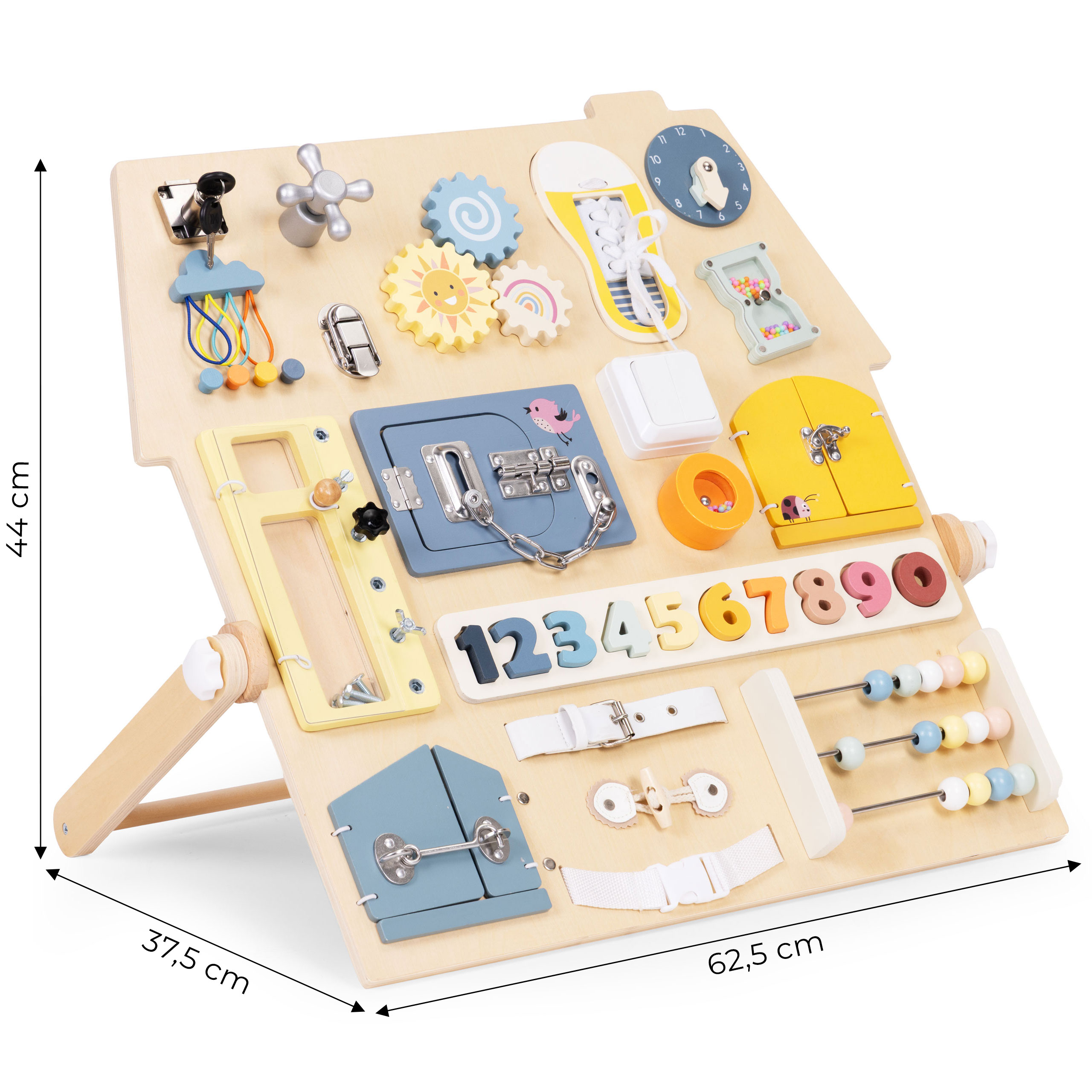 Drevená manipulačná doska je ideálnym nástrojom na každodennú hru, ktorý podporuje rozvoj dieťaťa prirodzeným spôsobom. Vďaka rôznym funkciám, ako naprzámky, ozubené kolesá, počítadlo, hodiny alebo šnúrky do topánok, batoľa si môže precvičovať zručnosť, učiť sa logickému mysleniu a rozvíjaťnezávislosť. Každý prvok je navrhnutý tak, aby podporoval činnosť aexperimenty - dieťa spoznáva svet prostredníctvom hmatu, pohybu a pozorovania.Stabilná konštrukcia umožňuje pohodlnú hru na podlahe a vďaka priateľskému farebnému prevedeniu sa tabuľa dokonale hodí do detskej izby. Nie je to len hračka - je to dobre premyslenýpodpora rozvoja vo forme pútavej zábavy.