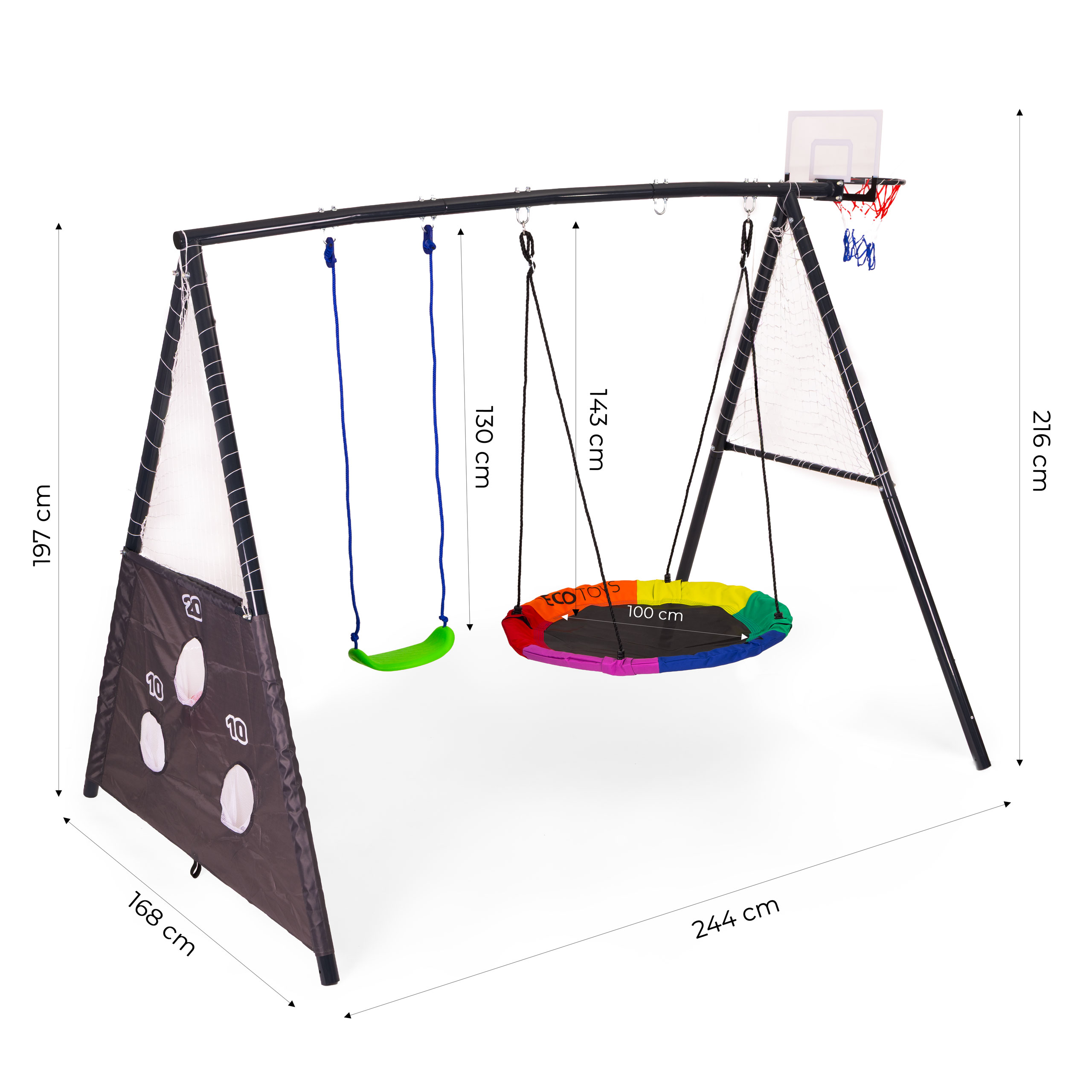 Detské ihrisko je ideálnym riešením na vytvorenie v záhradepriestor plný pohybu a radostikde môžu deti bezpečne tráviť čas vonku. Je ideálny na každodennú hru, rodinné stretnutia alebo letné dni na záhrade a ponúkarôzne aktivity na jednom mieste. Vďakapráškovo lakovaná oceľová konštrukcia celok je stabilný, aleodolnosť voči poveternostným vplyvomvďaka čomu dobre zvláda intenzívne používanie. Je to skvelá alternatíva k času strávenému pred obrazovkou, ktorý podporuje deti v aktivite a budovaní zdravých návykov.