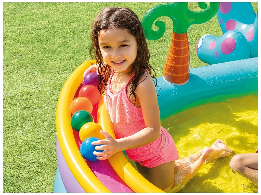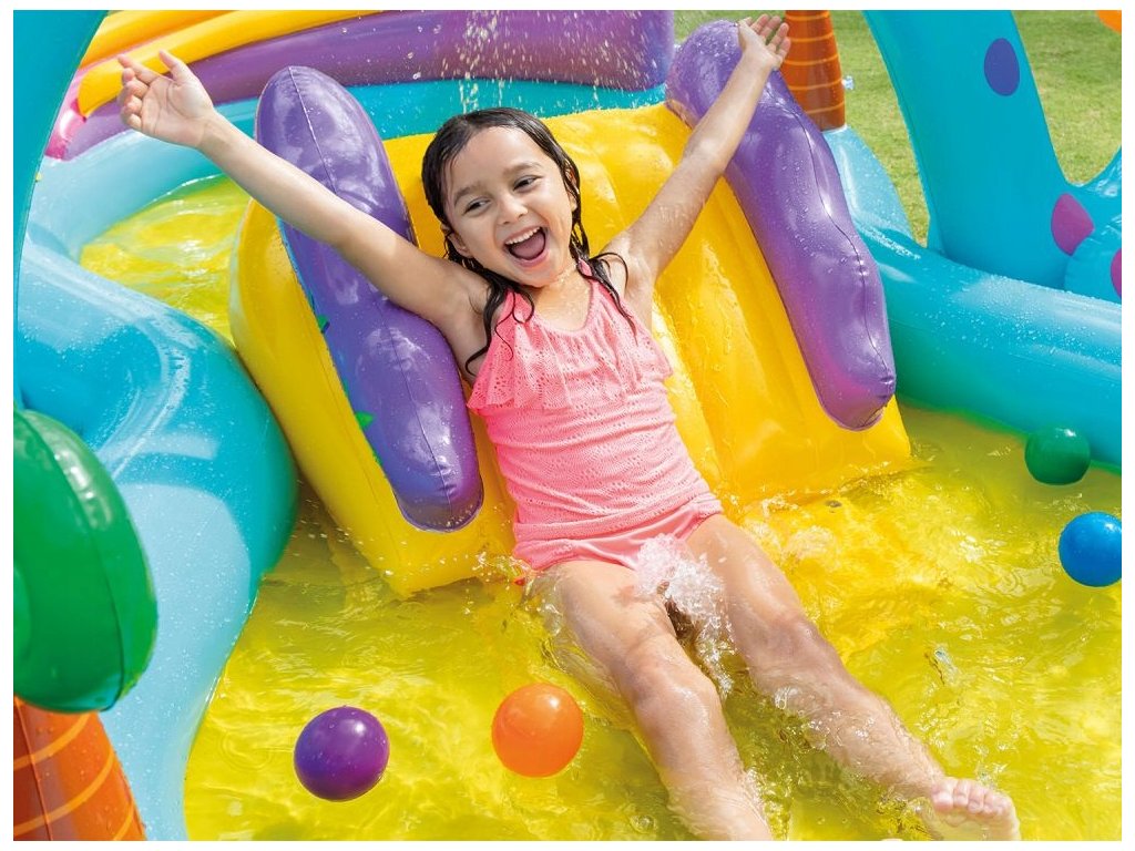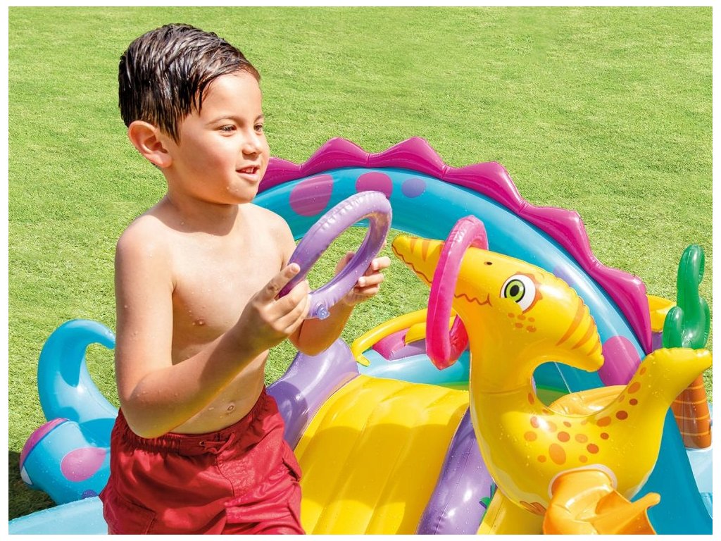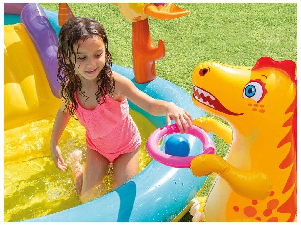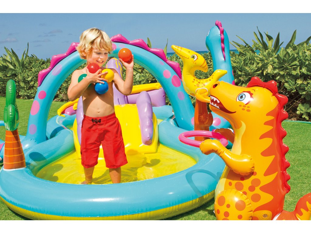 Nafukovacie ihrisko INTEX pozostáva z bazénik, šmykľavku a zábavné atrakcie, ako sú palmy alebo nafukovací pterodaktyl. Súprava ďalej obsahuje lopty, s ktorými môže batoľa plávať alebo hádzať do koša. Celá atmosféra ihriska je založená na motív dinosaura - Vaše dieťa bude môcť skĺznuť po šmýkačke . Celé to zabaví všetky deti počas horúcich letných dní.