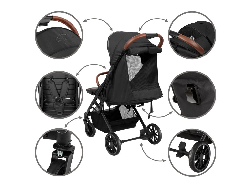 Kočík je vybavený praktickým a priestranným košíkom , do ktorého sa zmestí množstvo nevyhnutných vecí potrebných pri prechádzkach.