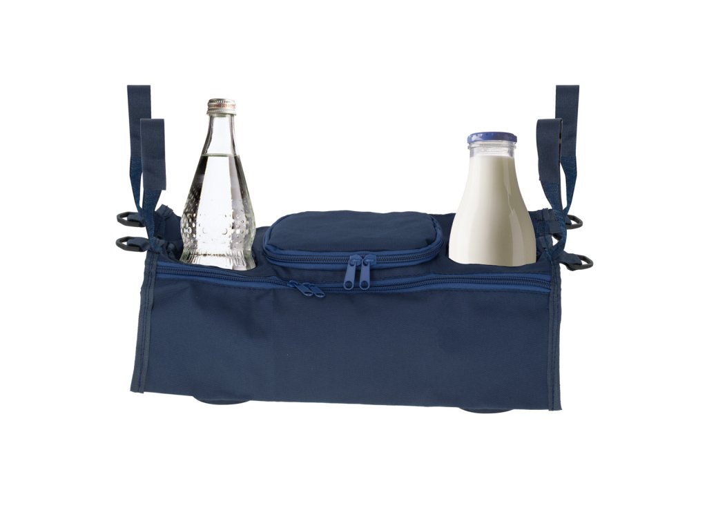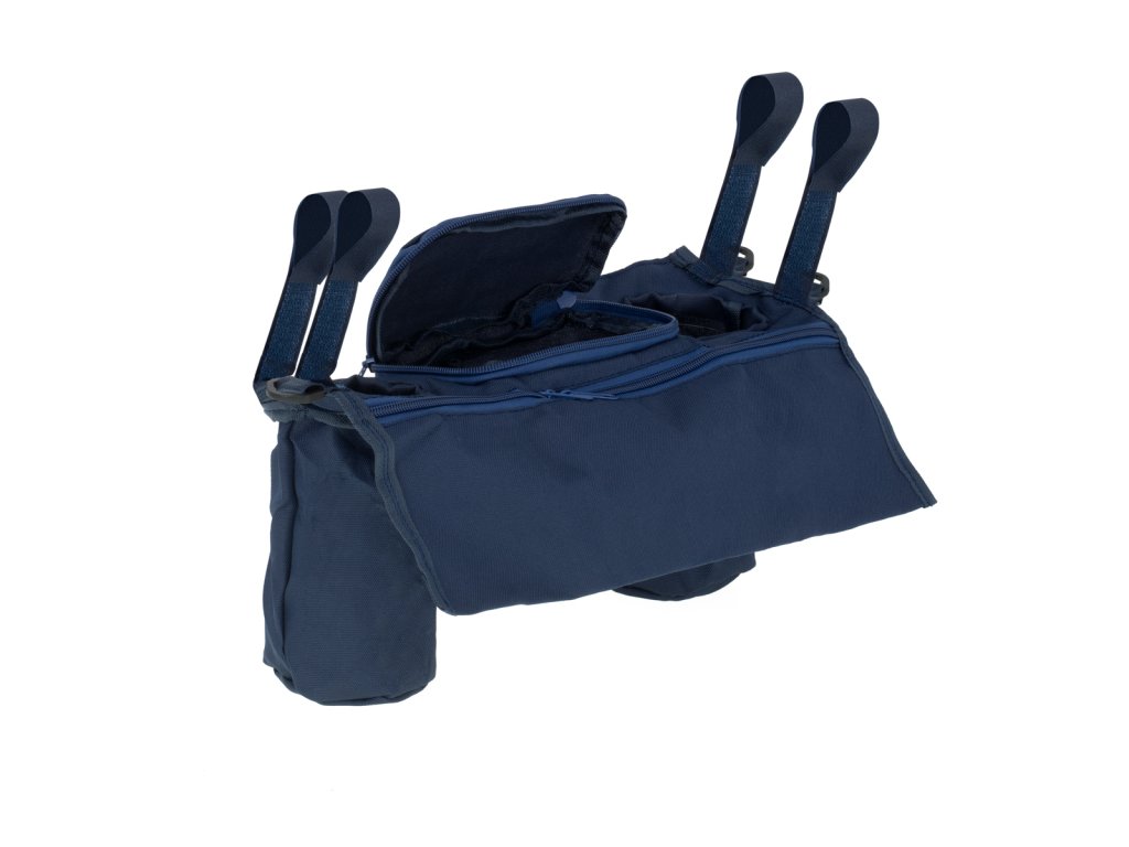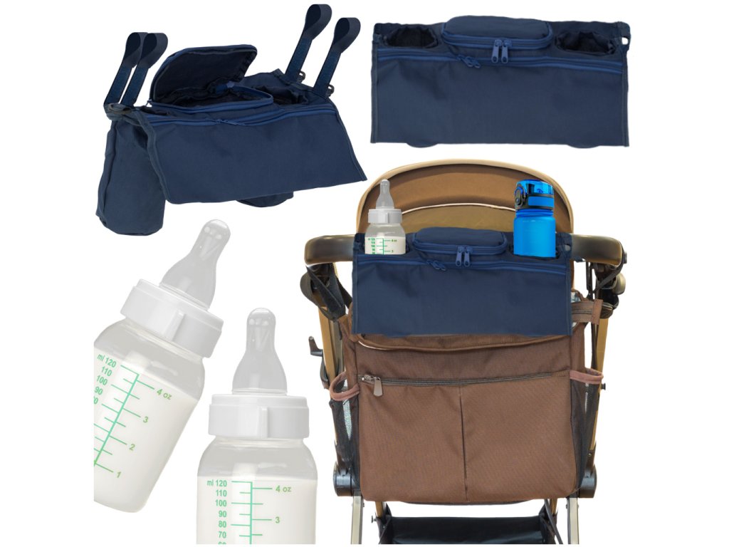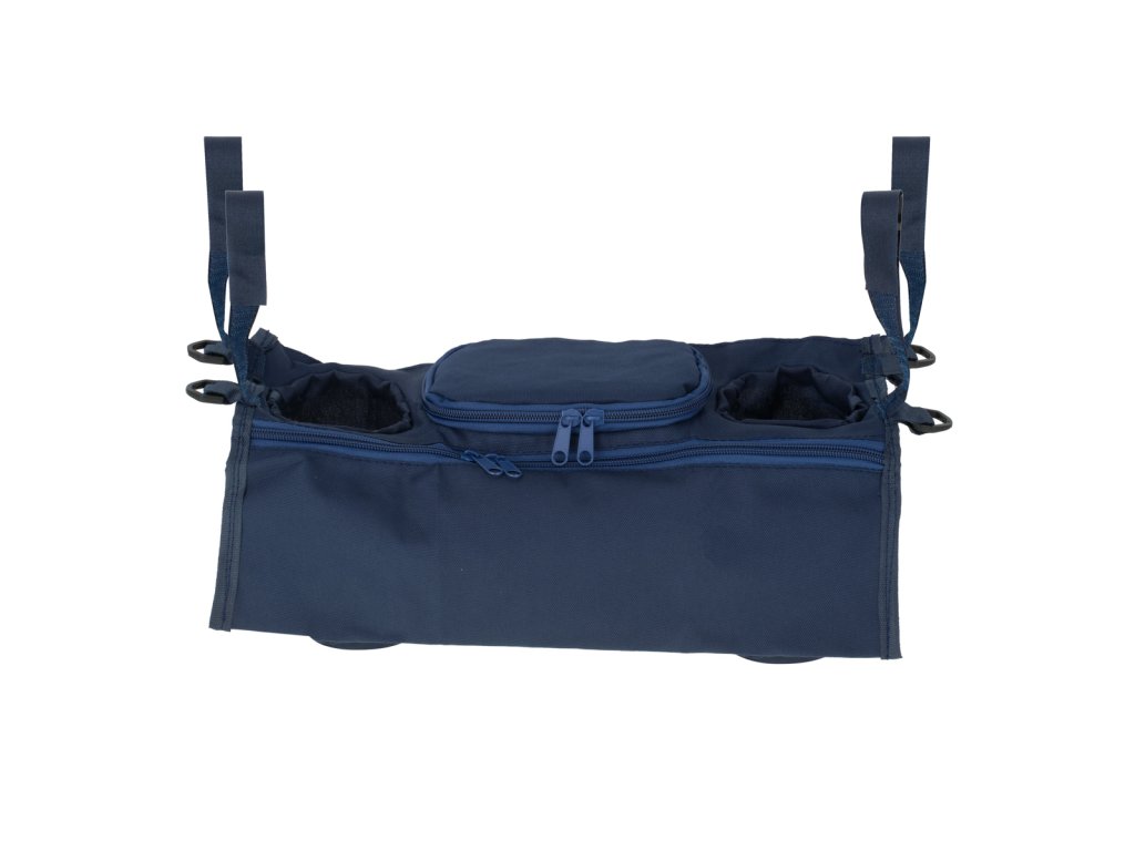 Organizér na vozík v námorníckej modrej farbe s 4 vreckami a jednoduchou montážou. Ideálny pre mladé mamičky na cesty s kočíkom. Praktický a štýlový spoločník pre usporiadanie všetkých potrebných vecí.