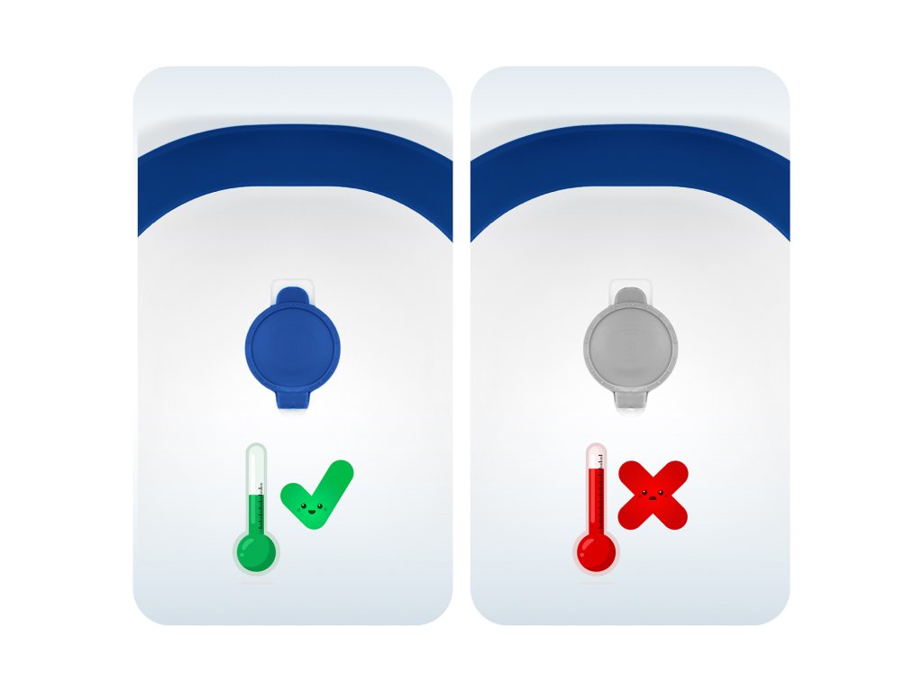 Ak teplota vody prekročí 38 °C, farba zátky sa zmení z modrej na bielu.