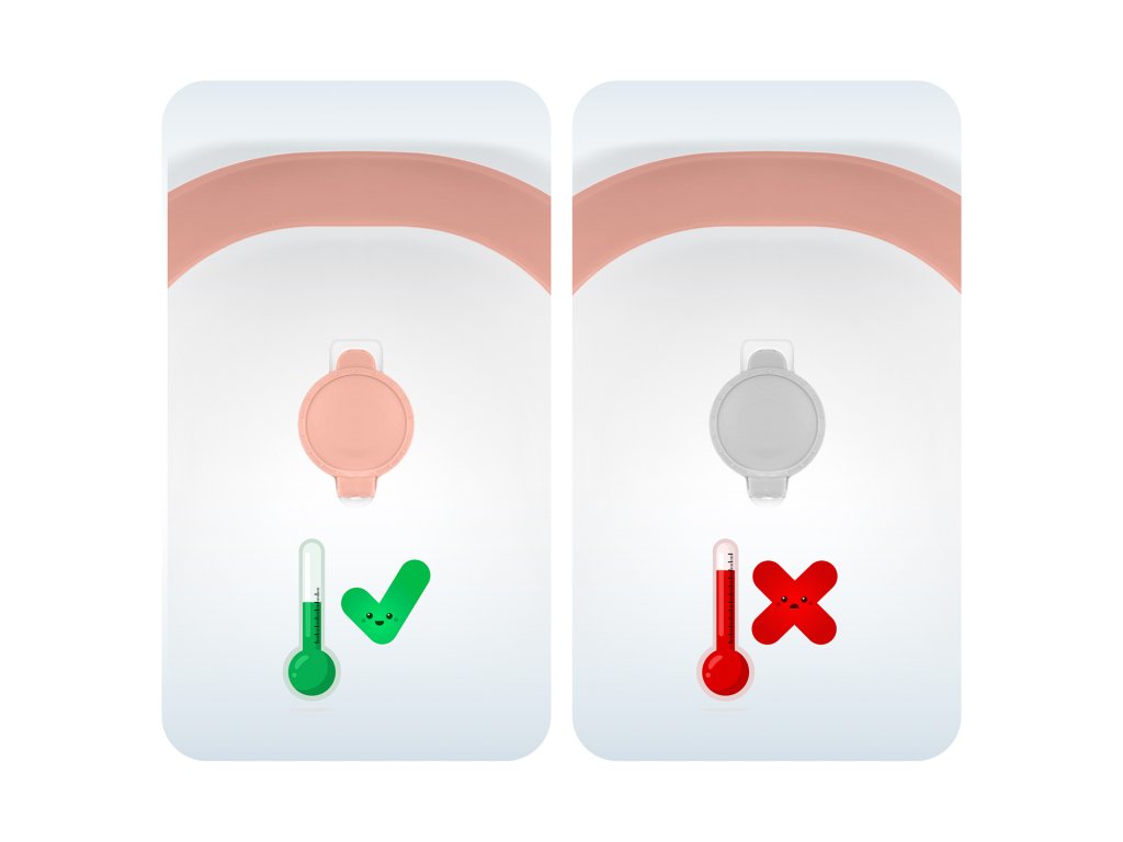 Ak teplota vody prekročí 38 °C, farba korku sa zmení z ružovej na bielu.