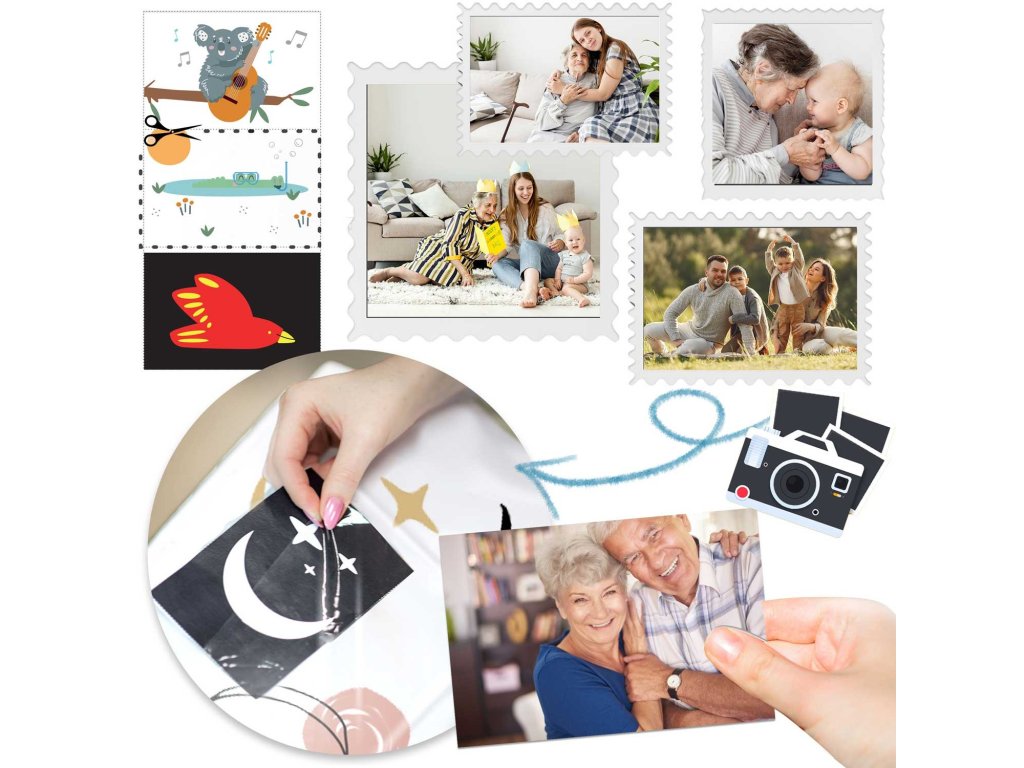 Pevne všité vrecká, do ktorého vložíte fotografie, kresby alebo obrázky podľa vlastného výberu. Dostanete 4 ilustrácie, ktoré môžete vystrihnúť z obalu - ekológia a praktickosť v jednom.