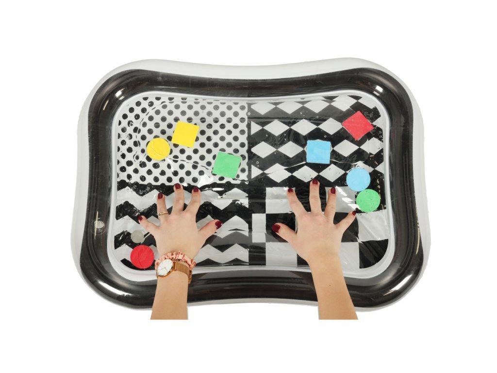 Vo vnútri podložky sú umiestnené farebné geometrické obrazce, ktoré sa pri pohybe dieťaťa pohybujú.