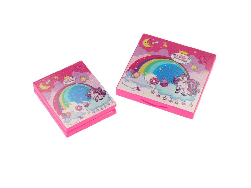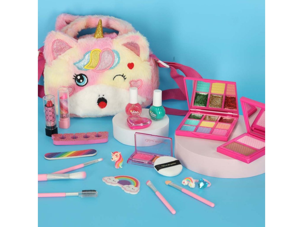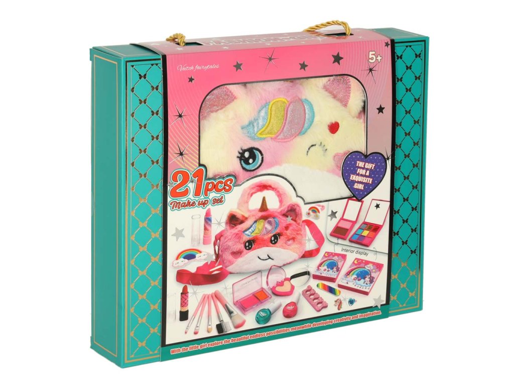 Rozkošná súprava s make-upom v taštičke s motívom jednorožca. Obsahuje očné tiene, rúže, laky na nechty, štetcov a ďalšie doplnky. Ideálna pre dievčatá od 5 rokov. Originálny darček v krásnom balení s lesklými detailmi.