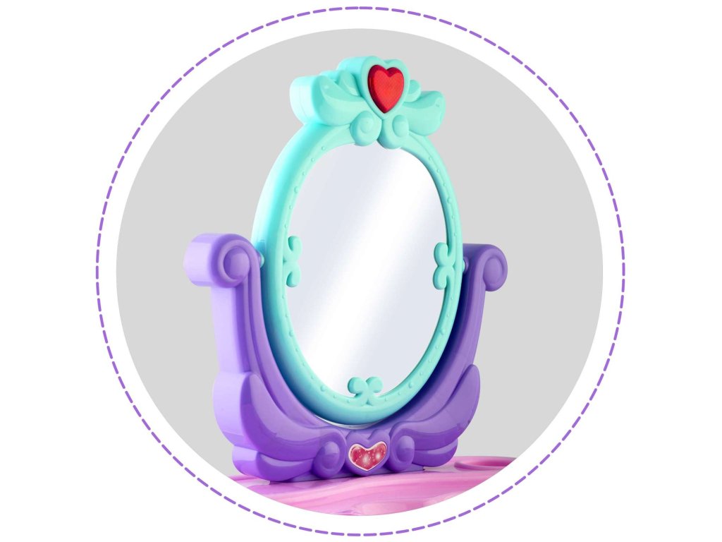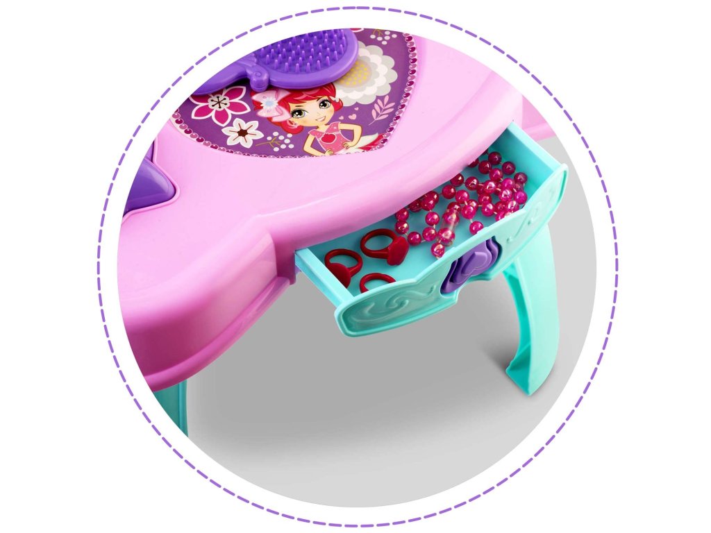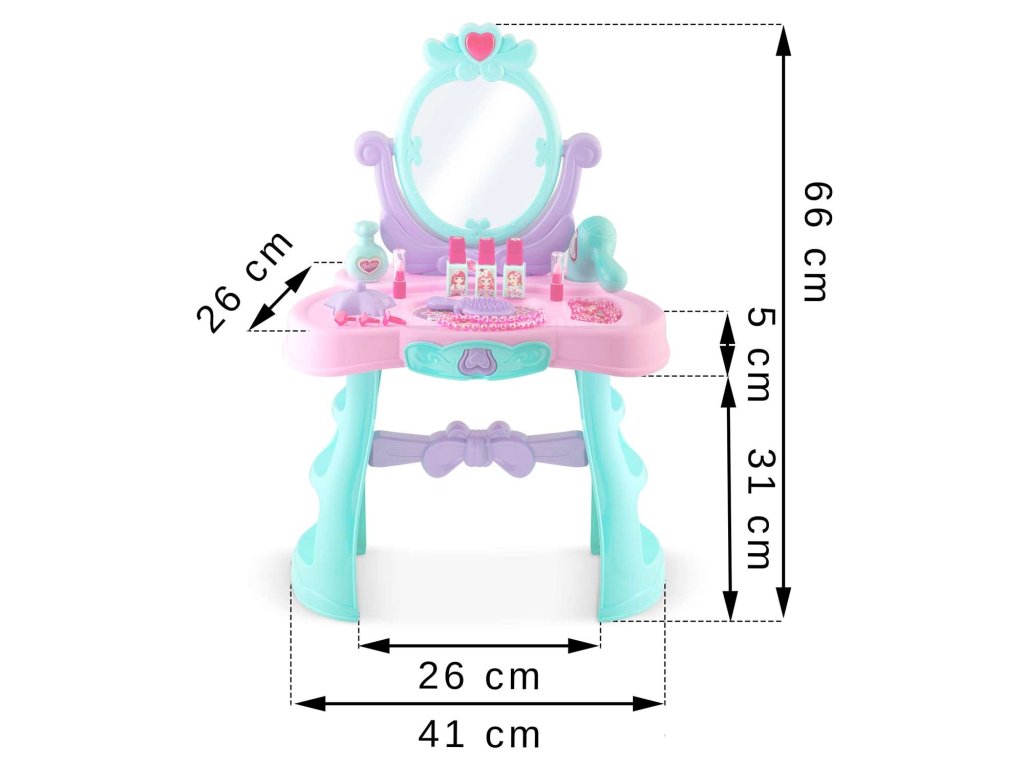 Pohyblivé prvky príslušenstva toalety pomáhajú vytvárať dojem autenticity, vďaka čomu sa každé dievča môže cítiť ako dospelá dáma. Vlastný toaletný stolík sa môže dlho stať jedným z jej obľúbené hračky.