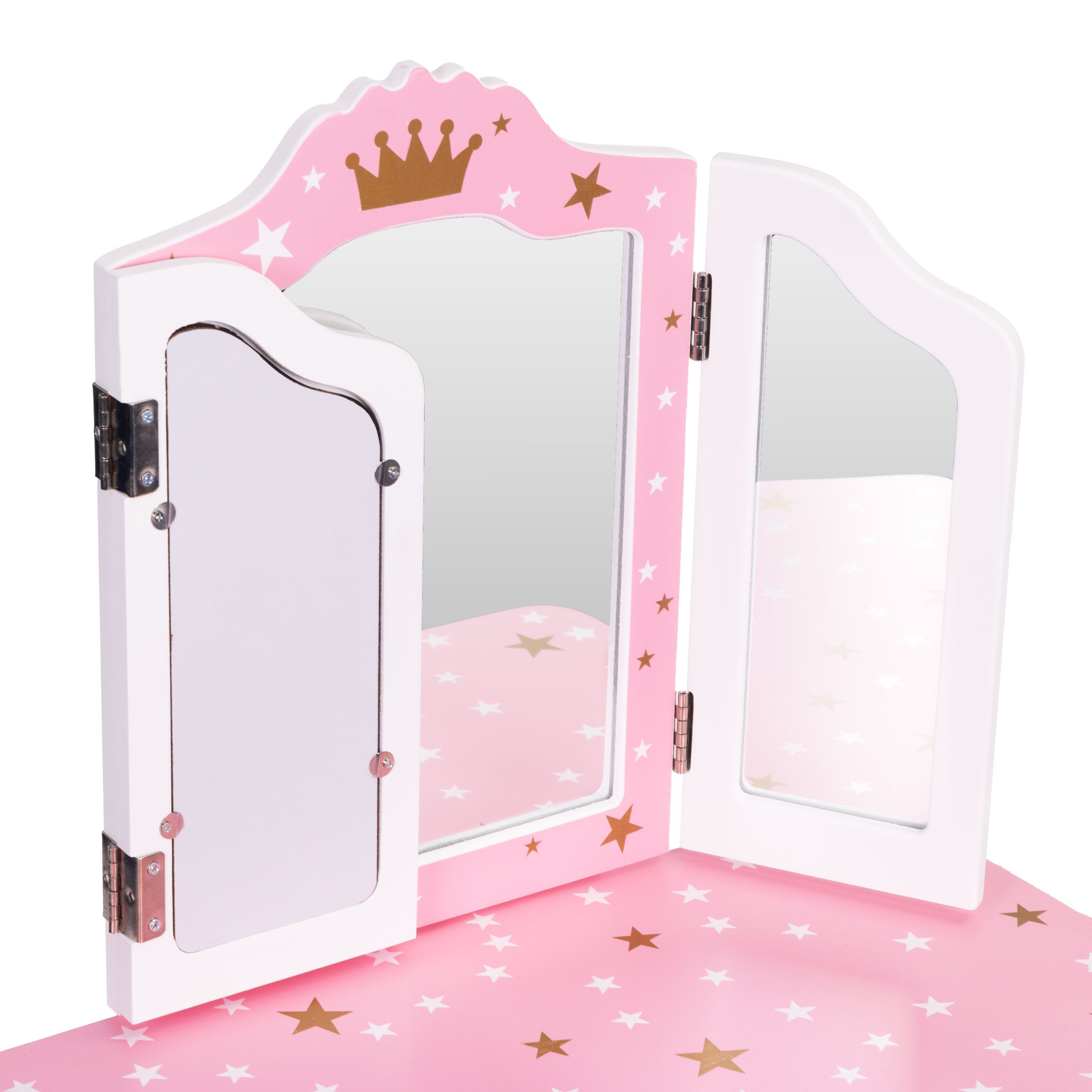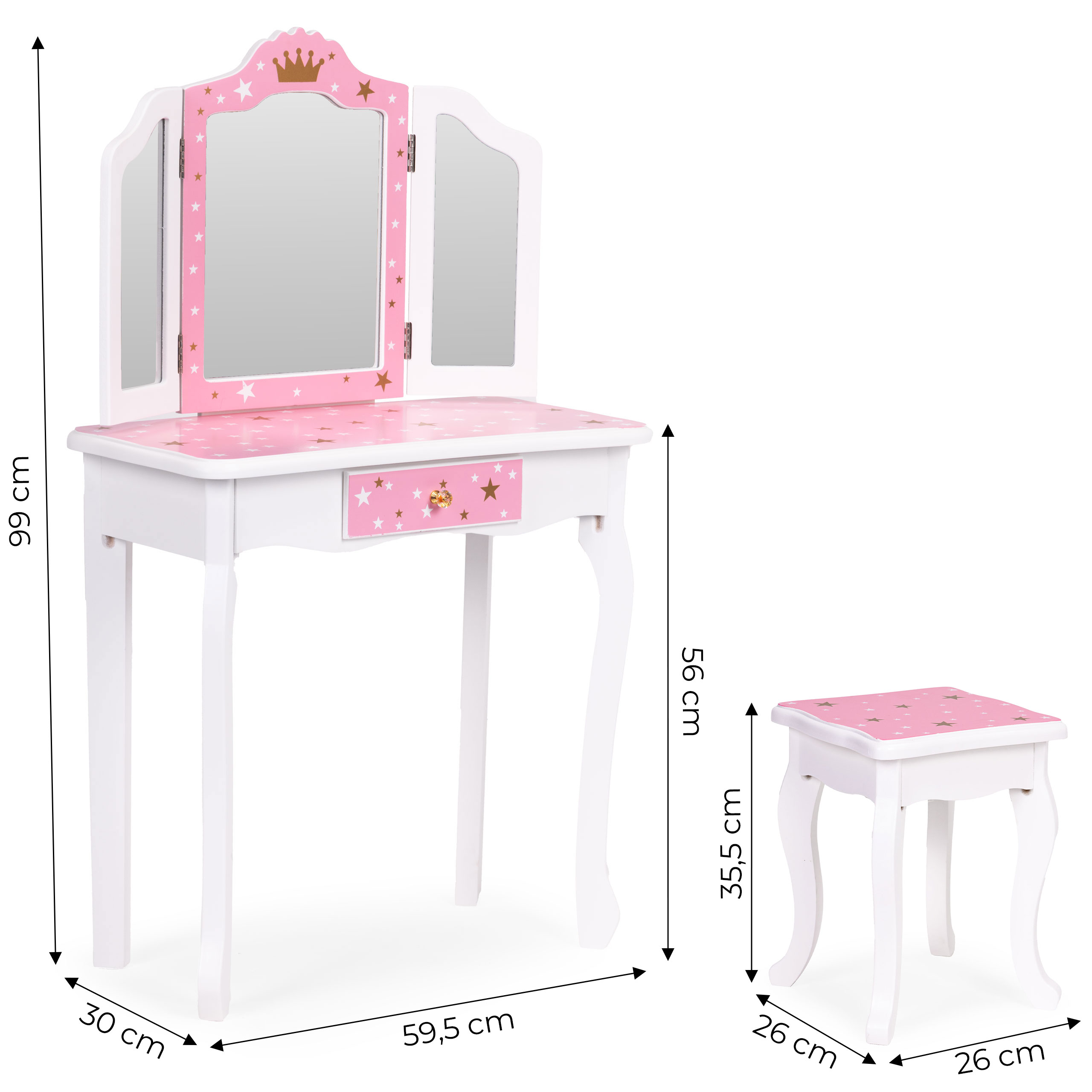Ústredným bodom toaletného stolíka je veľké trojité zrkadlo čo dodáva realistickosť každému hraniu. Bočné krídla sa dajú voľne nakláňať, čo umožňuje dieťaťu vidieť z rôznych perspektív - presne ako v skutočnom salóne krásy! Krásny ružový rám s motívom hviezdy a zlatou korunkou vytvára rozprávkovú atmosféru, ktorú si zamiluje každá malá princezná.