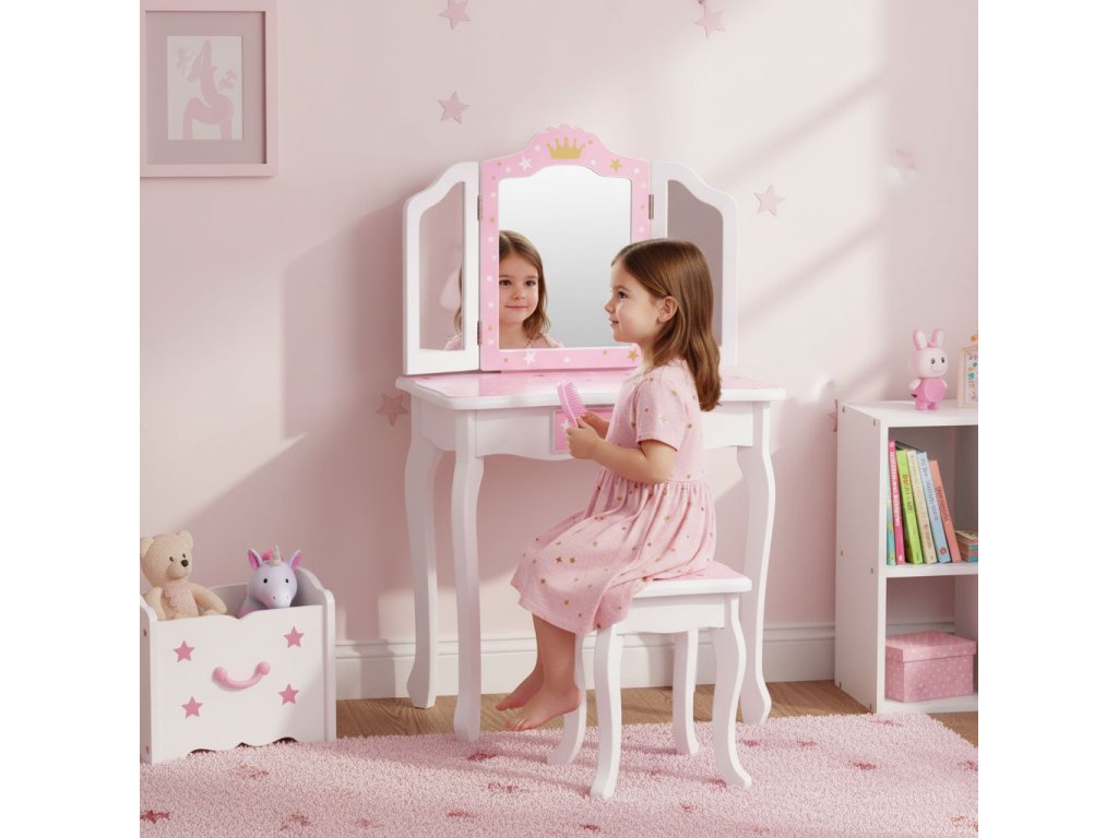 Detská toaletka s trojitým zrkadlom, stoličkou a zásuvkou