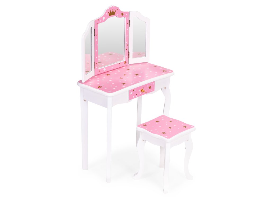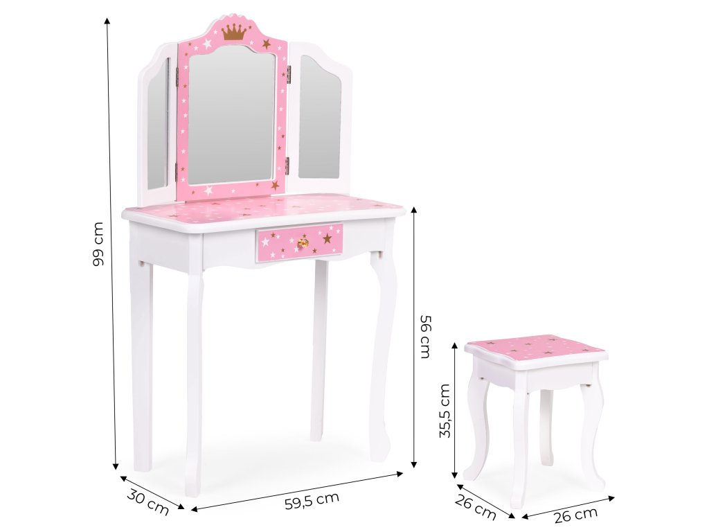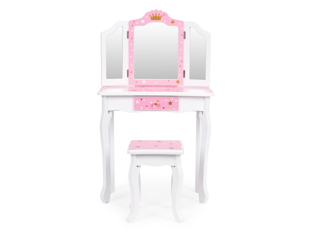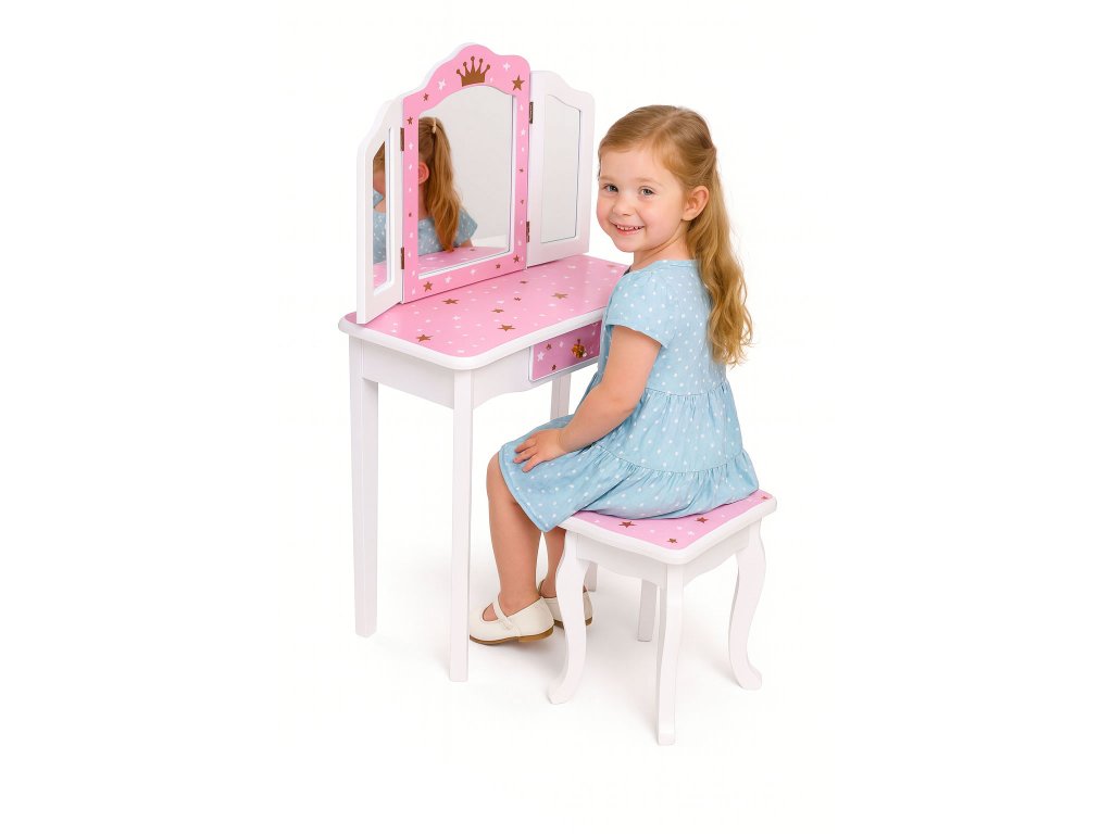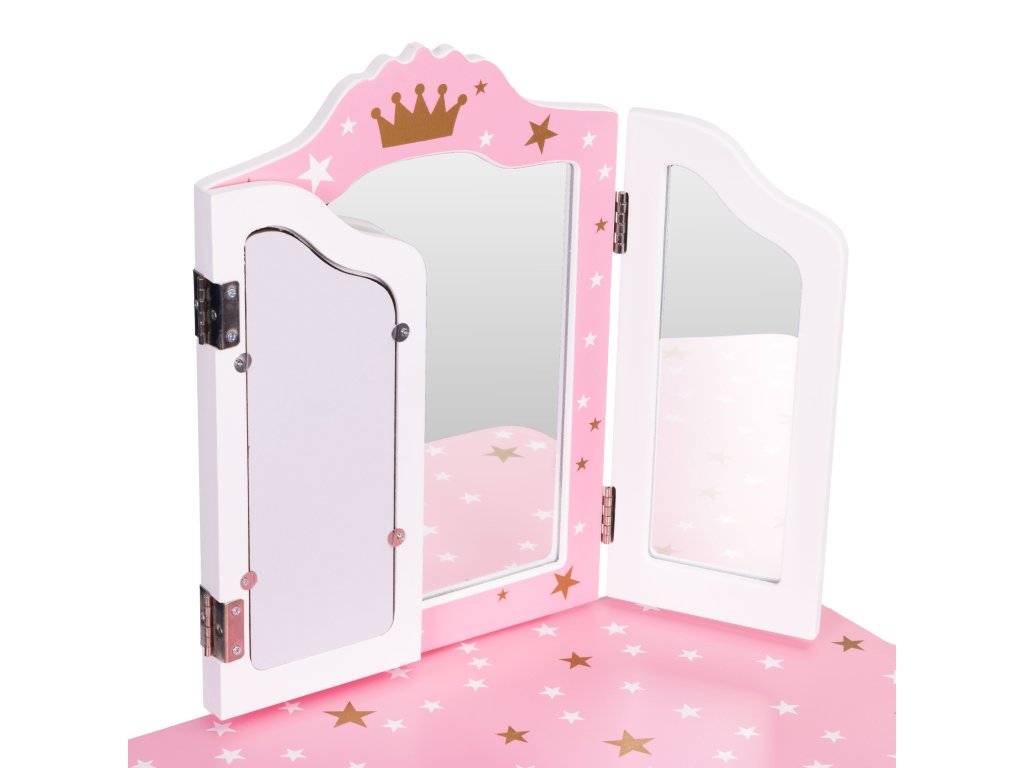 Ústredným bodom toaletného stolíka je veľké trojité zrkadlo čo dodáva realistickosť každému hraniu. Bočné krídla sa dajú voľne nakláňať, čo umožňuje dieťaťu vidieť z rôznych perspektív - presne ako v skutočnom salóne krásy! Krásny ružový rám s motívom hviezdy a zlatou korunkou vytvára rozprávkovú atmosféru, ktorú si zamiluje každá malá princezná.