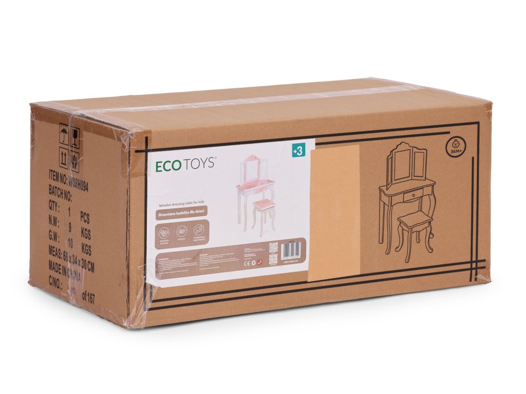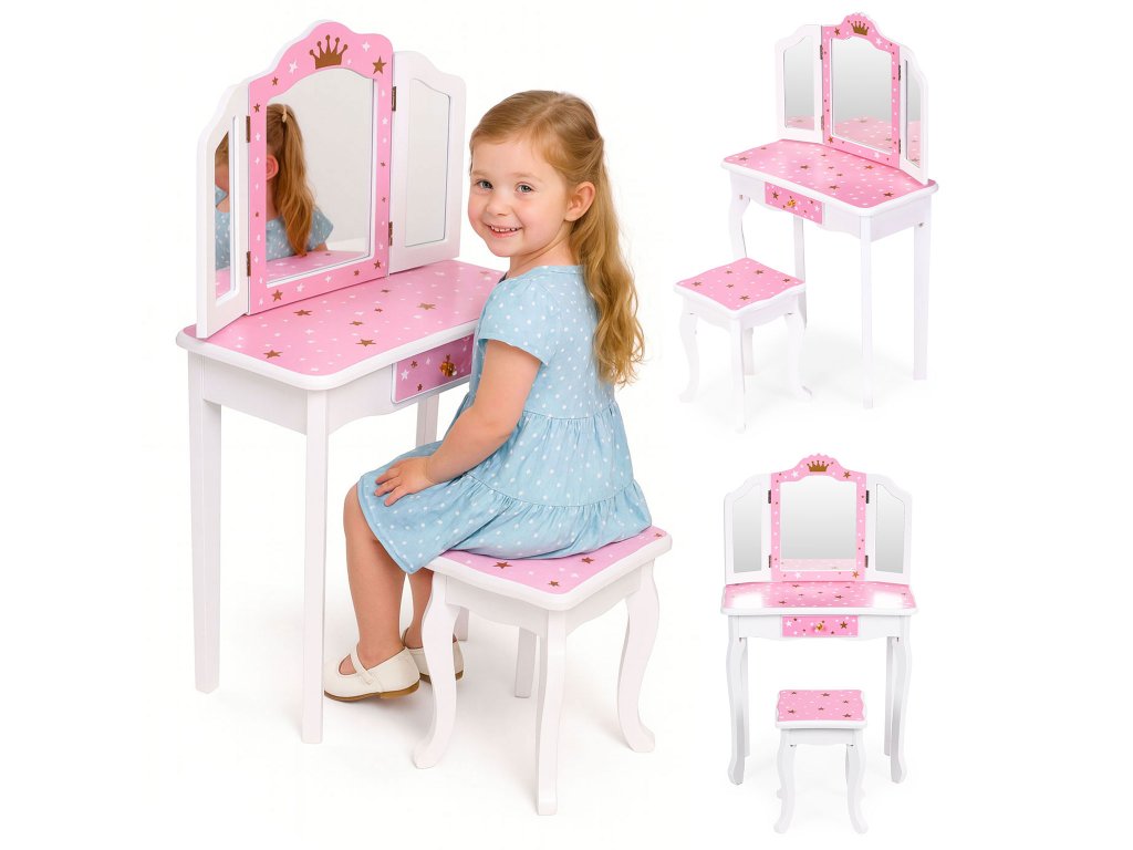 Toaletný stolík ECOTOYS je nielen očarujúcim kusom nábytku, ale aj ideálny priestor na tvorivé hry. Vďaka trojitému zrkadlu a funkčnej zásuvke sa dieťa môže hrať s každodennými rituálmi starostlivosti o telo, napodobňovať dospelých a rozvíjať sociálne zručnosti a predstavivosť. Tento kus nábytku je ideálny do detskej izby ako dekoratívny prvok a praktické miesto na odkladanie drobností. Toaletný stolík učí samostatnosť, poriadkumilovnosť a zmysel pre detail a zároveň poskytuje veľa zábavy pri hre na dom, princezné alebo kozmetický salón.