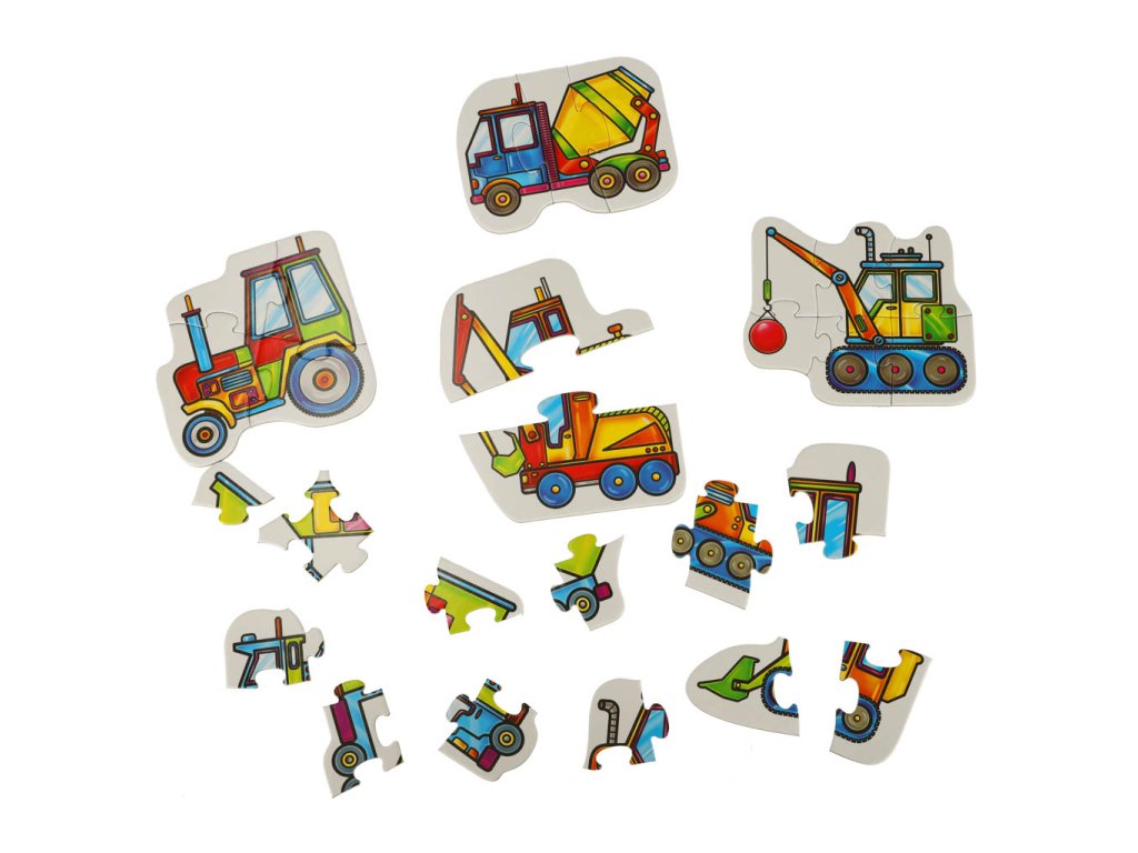 Alexander Puzzle pre batoľatá - Stavebné stroje. Puzzle pre najmenších od 2 rokov. Atraktívne farby, jednoduché tvary a veľké bloky uľahčujú rozvoj detí. 6 vzorov od 2 do 7 dielikov podporuje objavovanie a logické myslenie. Rozmery: 29x19x4 cm.