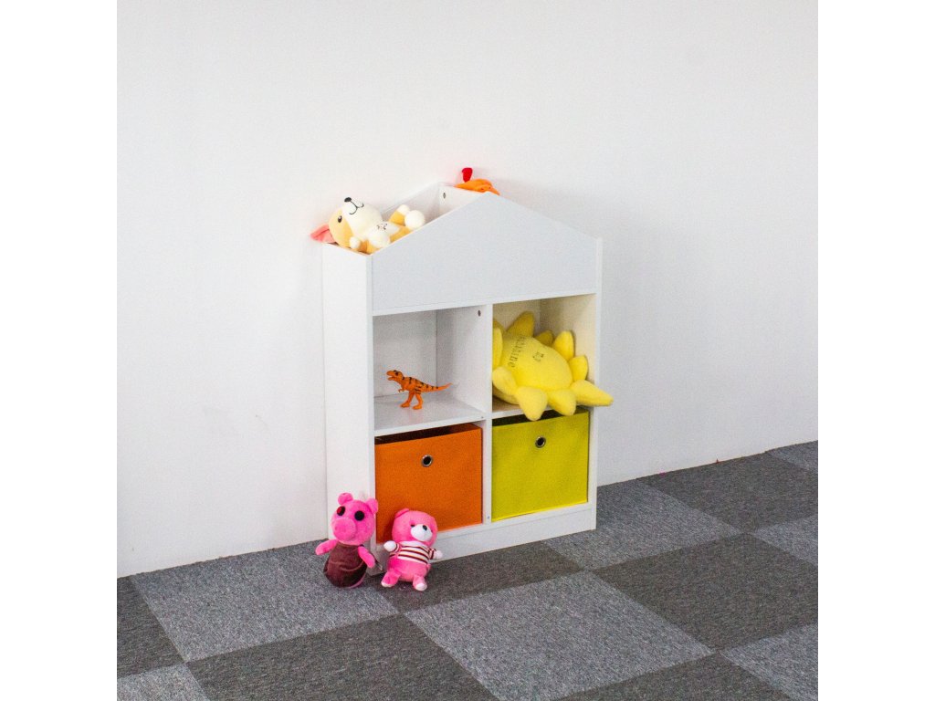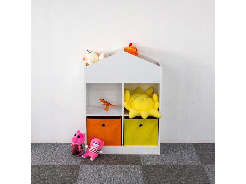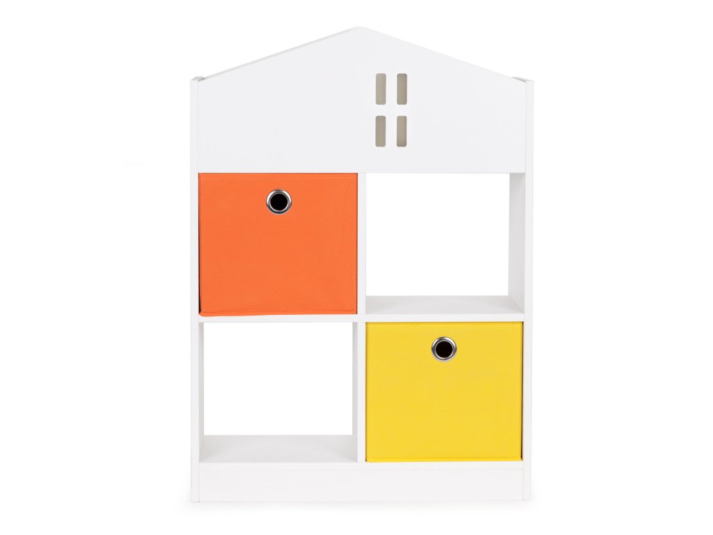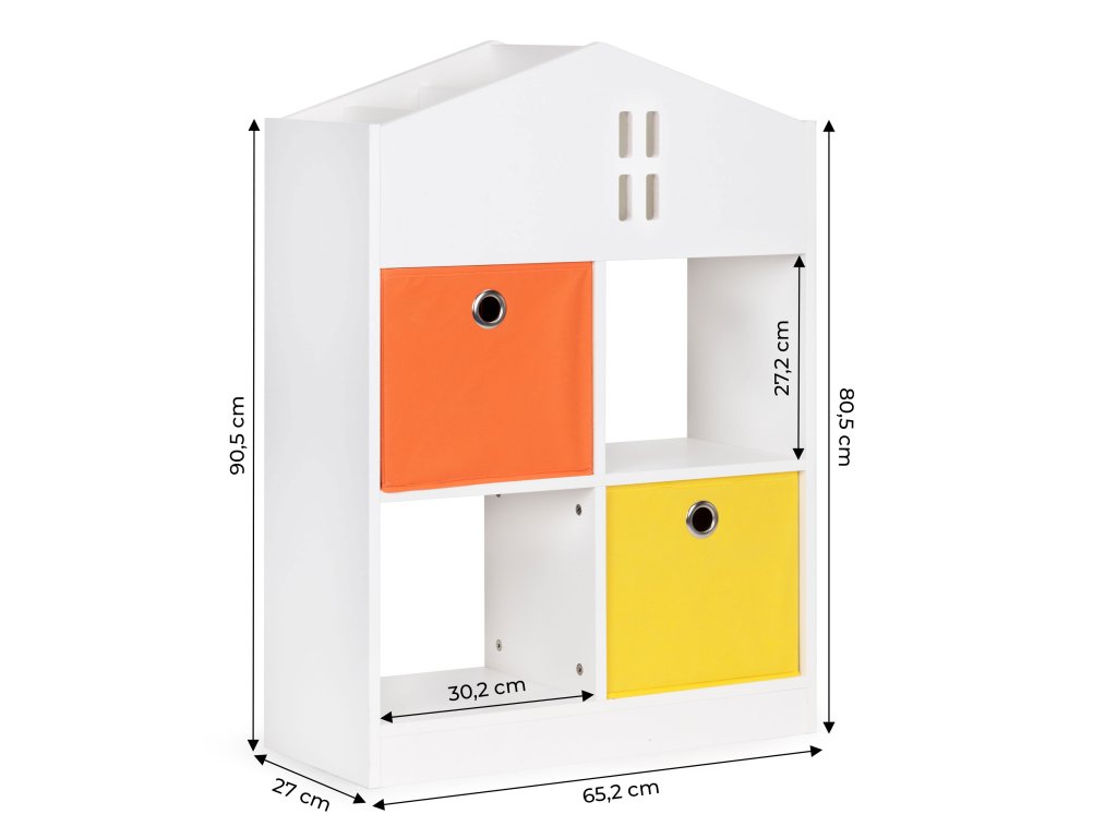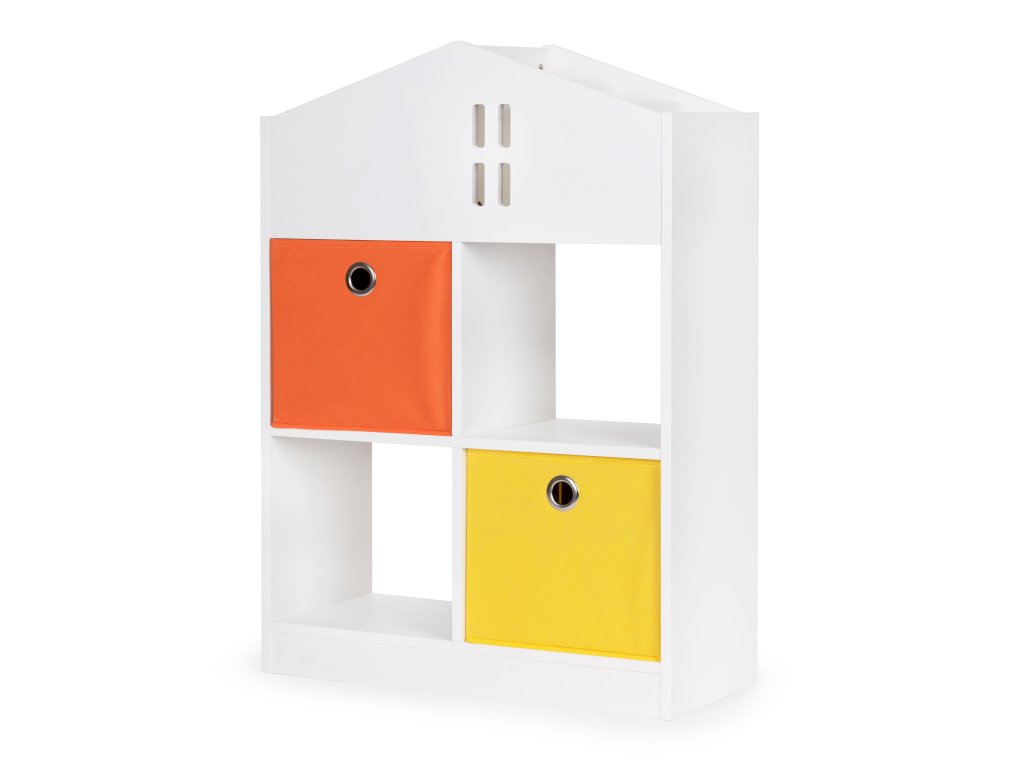 Nábytok bol vyrobený z odolná drevotrieska a dokončil s dyhou odolnou voči poškodeniu. Štyri priestranné police a priehradky pojmú hračky, knihy a všetko ostatné, s čím sa vaše dieťatko rado hrá. Okrem toho súprava obsahuje 2 priestranné textilné koše, ideálne na kocky alebo menšie hračky.