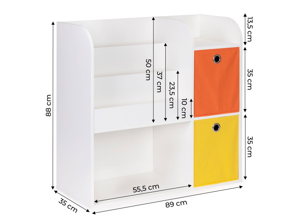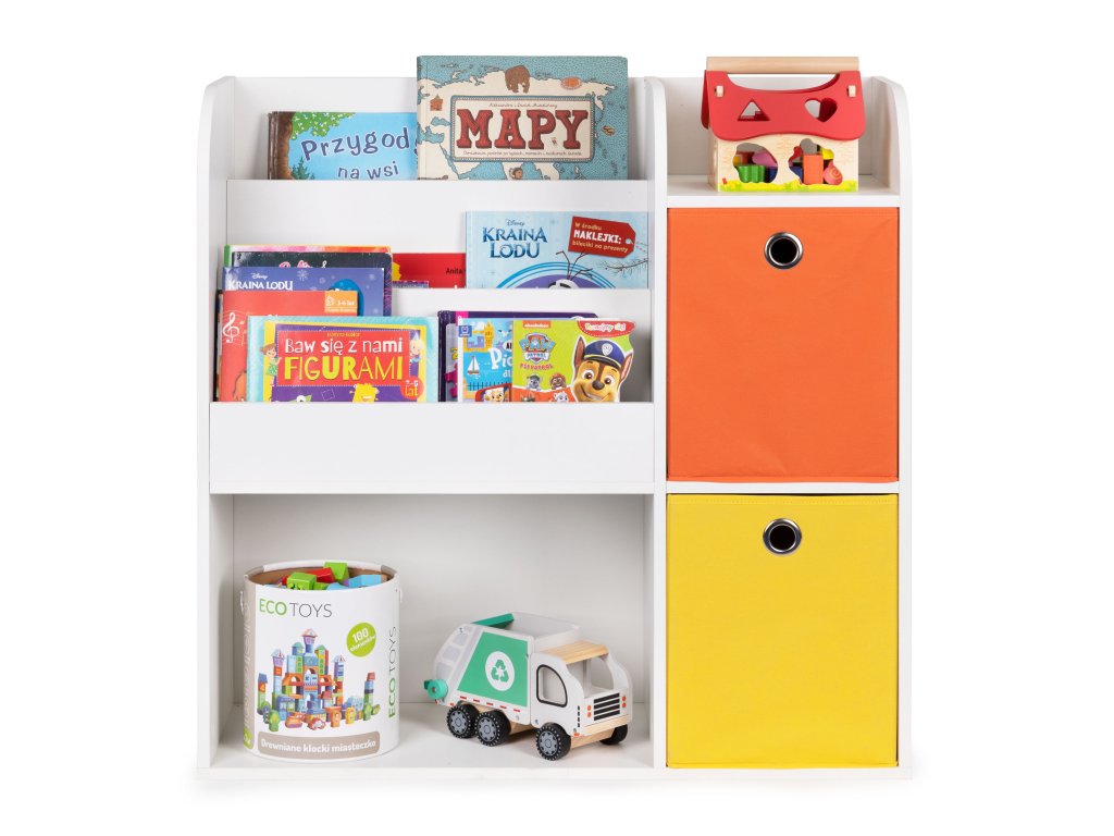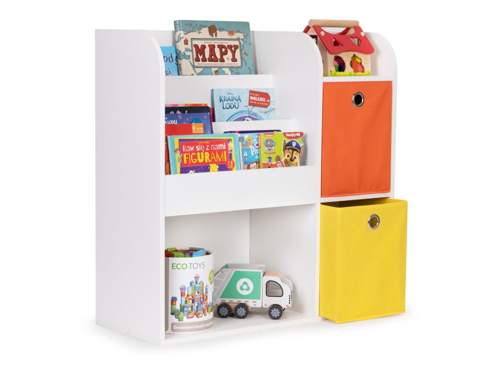 Nábytok bol vyrobený z odolná drevotrieska a dokončil s dyhou odolnou voči poškodeniu. Hlboké priehradky pojmú vaše obľúbené knihy, albumy, omaľovánky a časopisy, zatiaľ čo police sú ideálne na odkladanie hračiek. Okrem toho súprava obsahuje 2 priestranné textilné koše, ideálne pre tehly a iné príslušenstvo.
