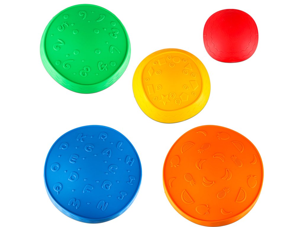 - 5 × farebné nášľapné kamene (rôzne vzory a textúry):- Červený (so šmýkačkami)- Žltý (s číslicami)- Oranžový (s motívom ovocia)- Modrý (s písmenami)- Zelený (s číslicami)- 1 × návod na použitie- 1 × kartónová krabica
