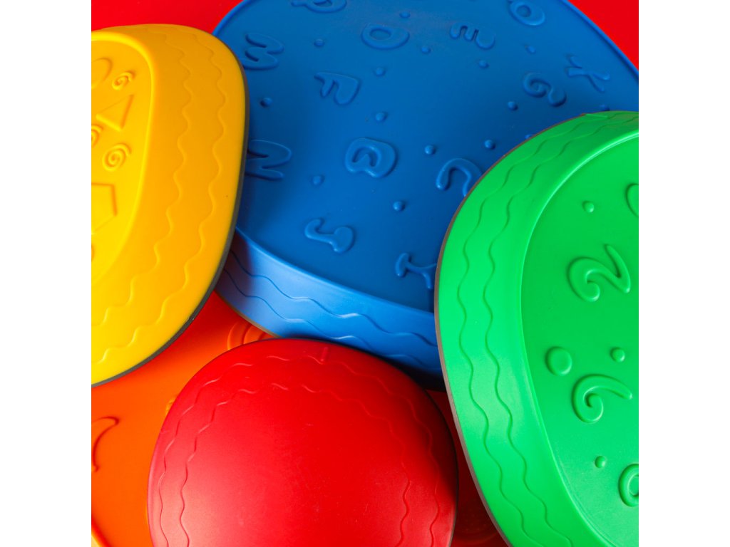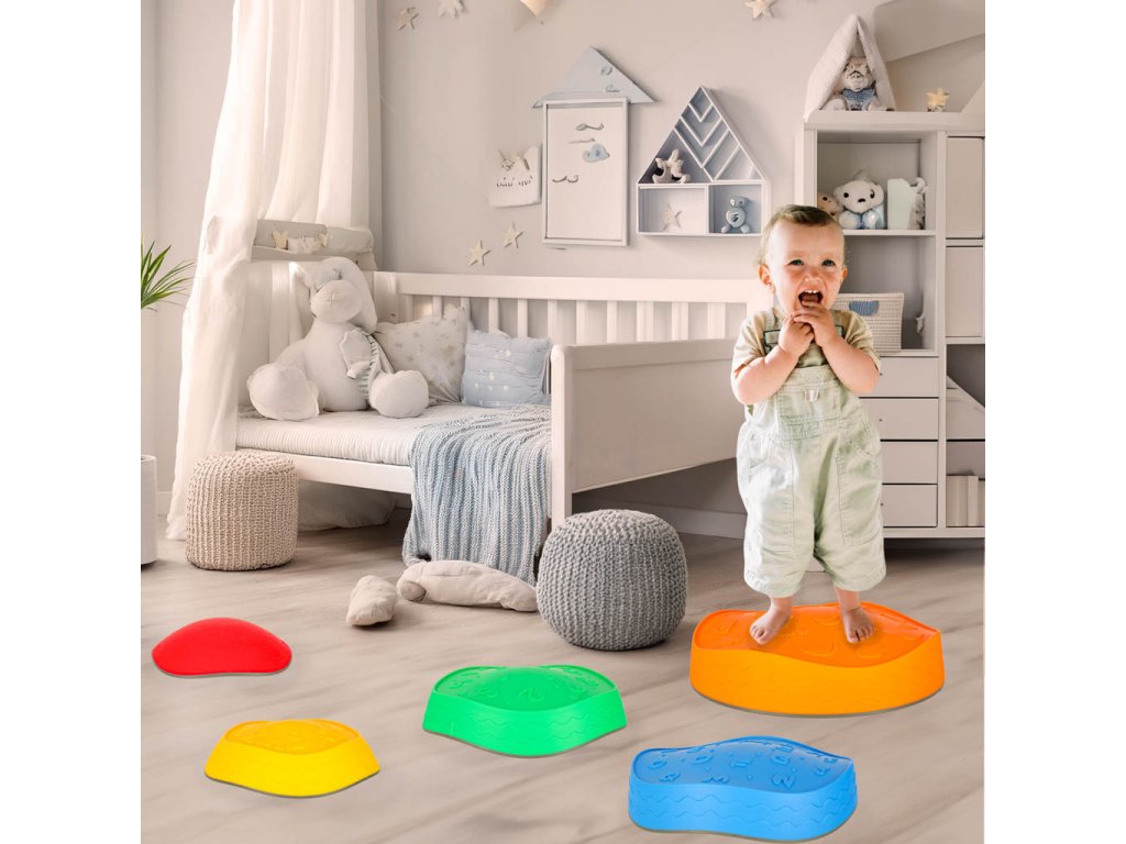 Pre pohodlie a bezpečnosť najmenších je každý kameň vybavený protišmykovými podložkami, ktoré zabraňujú kĺzaniu na rôznych povrchoch. Vysokokvalitný polyuretánový materiál je trvanlivý, odolný voči poškodeniu a príjemný na dotyk.