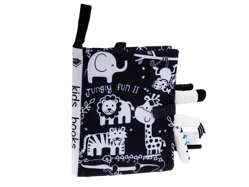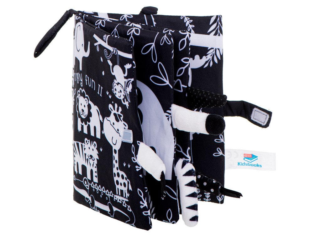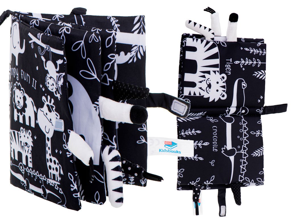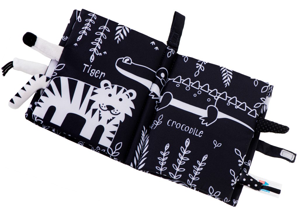 Kúzelná textilná kniha s kontrastnými vzormi je skvelá pre deti, ktoré práve spoznávajú svet. Čiernobiele zvieratá budú skvelým úvodom do sveta afrických zvierat.
