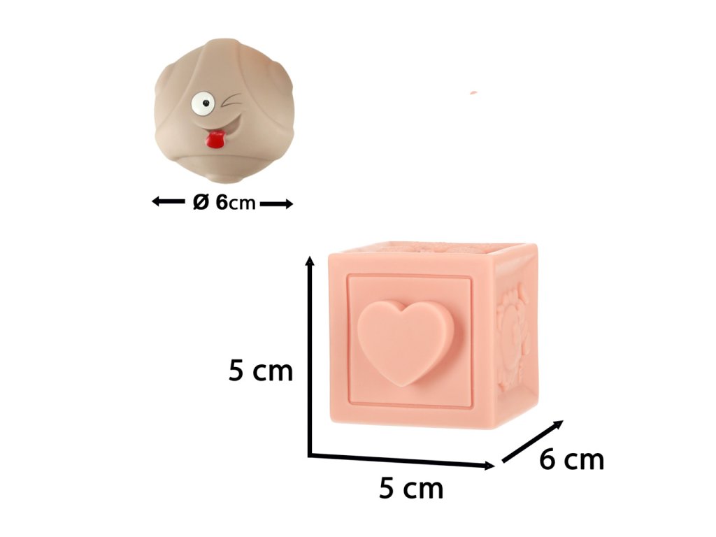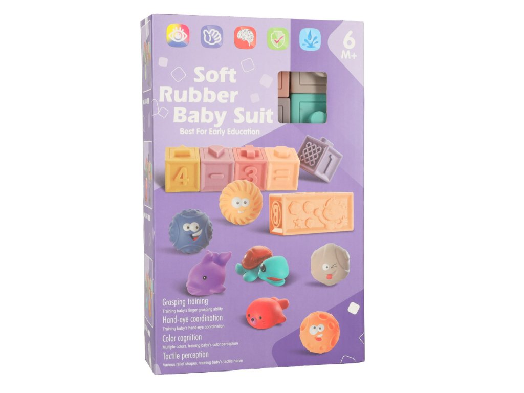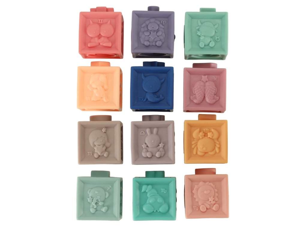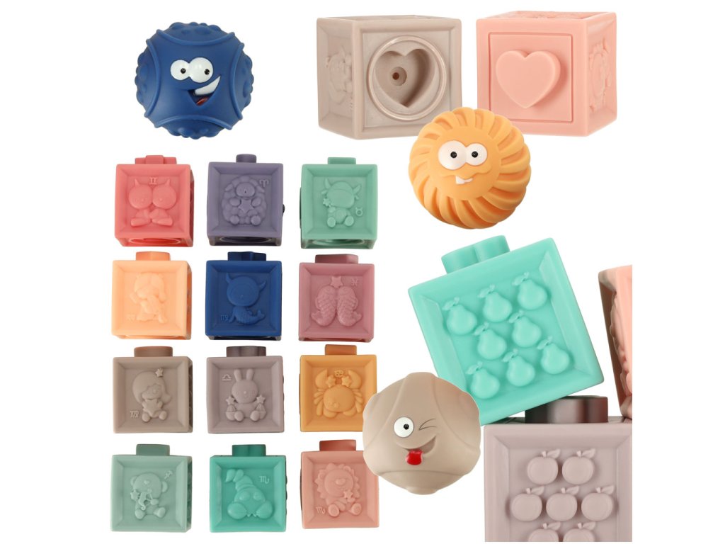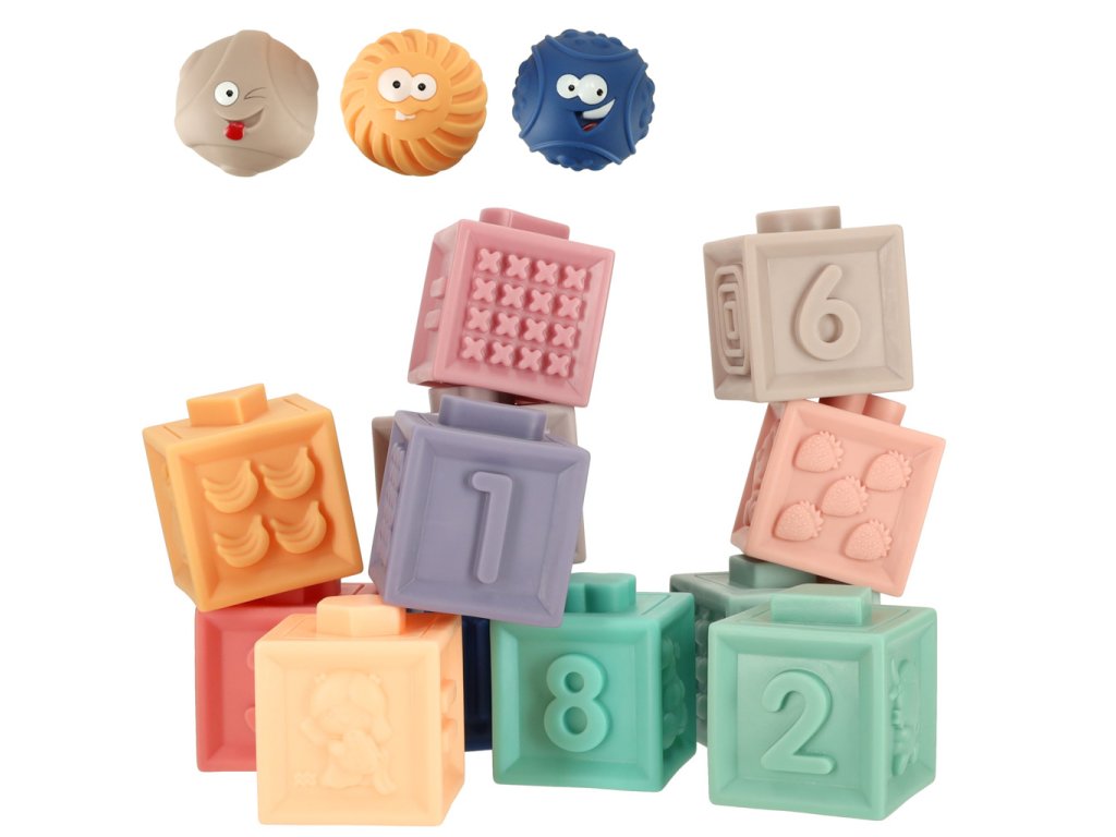 Súprava obsahuje 12 blokov a 3 guľôčky. Vhodné pre deti od 18 mesiacov. Materiál: silikón. Rozmery: blok 5 cm x 5 cm x 6 cm, balenie 28 cm x 16,5 cm x 6,5 cm. Kreatívna hra s kvalitným výrobkom v kartónovom obale.