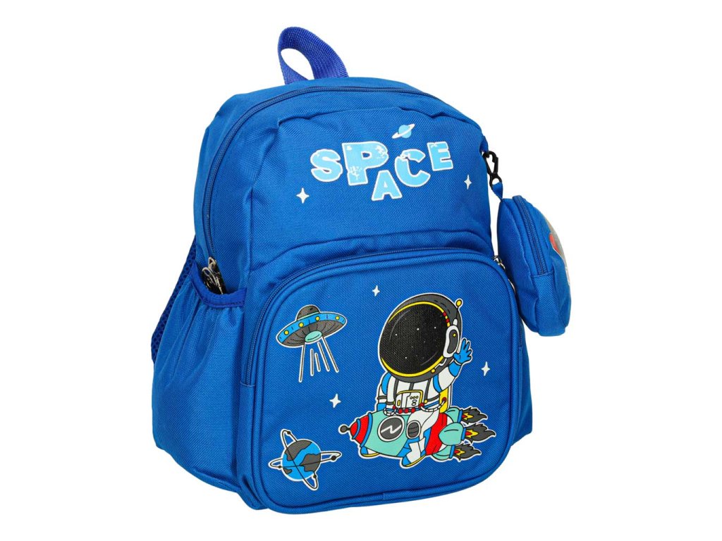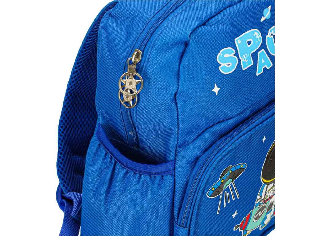 - 1× veľká hlavná priehradka - zmestia sa do nej raňajky, oblečenie a dokonca aj obľúbený plyšový medvedík- 1× vnútorné vrecko - na malé tajomstvá- 1× predné vrecko - ideálne na poklady a drobné občerstvenie- 1× okrúhle vrecko - štýlová a praktická ozdoba- 2× bočné vrecká - zmestí sa do nich fľaša na vodu alebo fľaša. - Vek dieťaťa: 3+- Materiál: nylon s priedušnou bavlnenou sieťovinou- Farba: modrá (vzor astronautov)- Typ zapínania: zips (zips)- Popruhy: nastaviteľné, mäkké- Objem: cca 7-7,5 l- Hmotnosť: ľahký batoh s hmotnosťou: 320 g