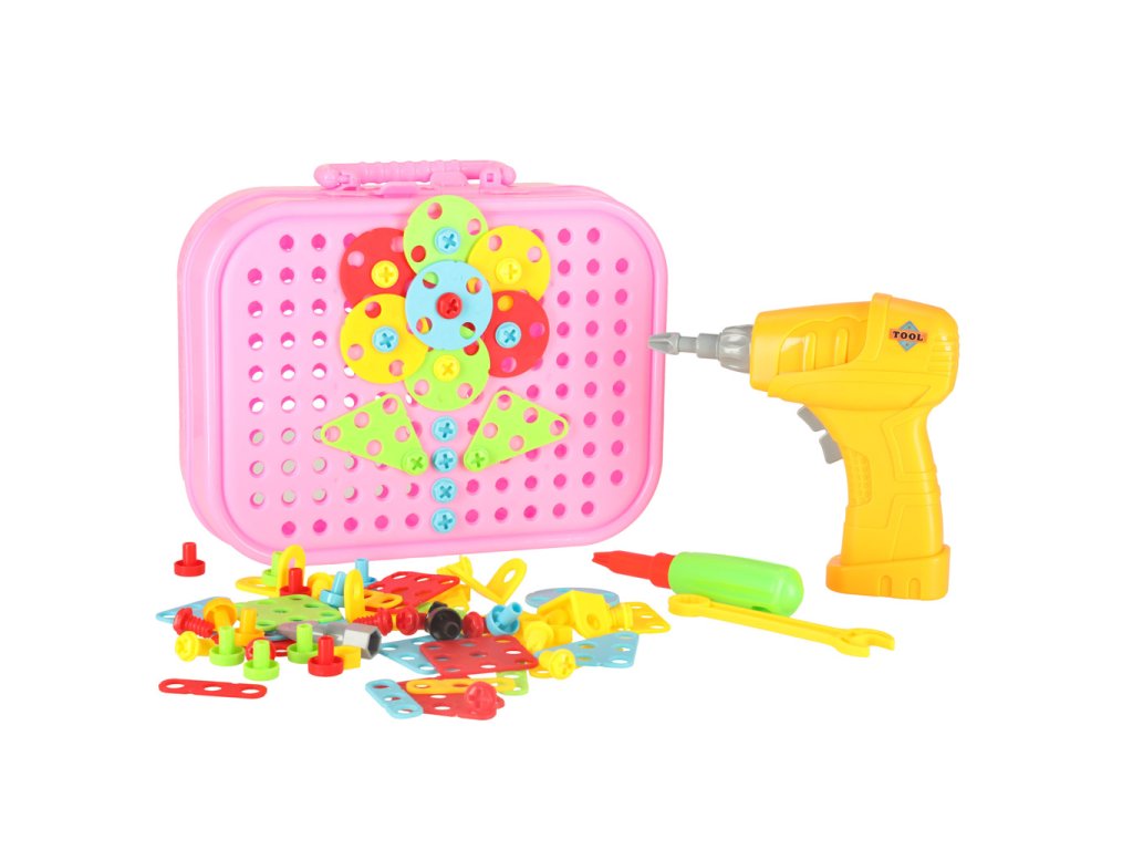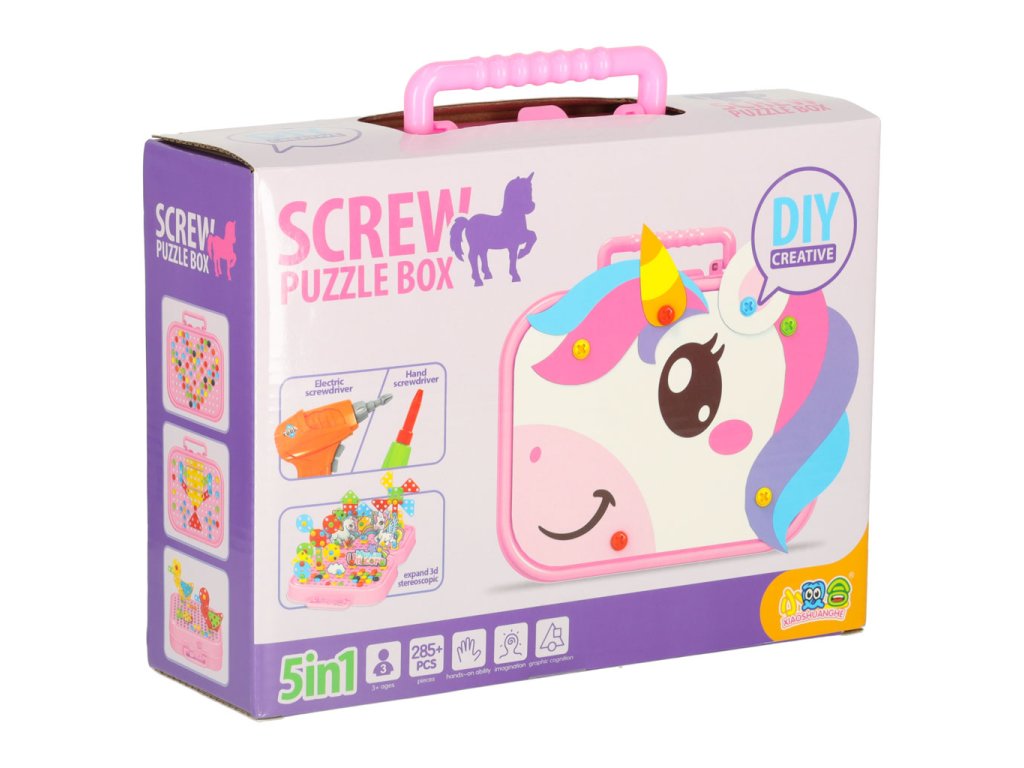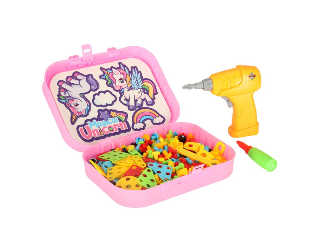 Rozmerný skrutkovač s množstvom príslušenstva a dekoráciou jednorožca pre deti od 3 rokov. Obsahuje 285 dielov vrátane skrutiek, tehlí a nástavcov. Batérie nie sú súčasťou balenia. Perfektný darček v pevnom kufríku.
