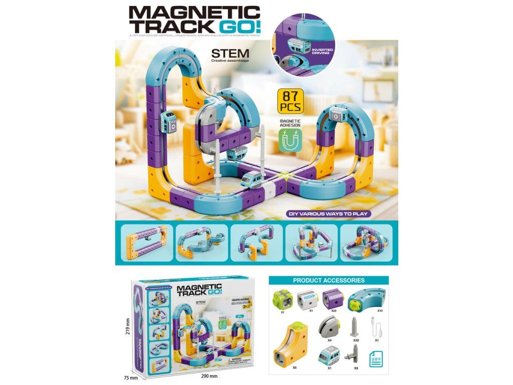 Funckje: • Magnetyczny system łączenia - elementy łączą się automatycznie dzięki magnesom - szybkie i intuicyjne budowanie torów• Elastyczne moduły toru - możliwość tworzenia zakrętów, pętli i konstrukcji 3D (również odwróconych)• Autko porusza się samodzielnie - po torze, także po odcinkach pionowych i „do góry nogami”• Autko z akumulatorem (ładowane) - autko z wbudowanym akumulatorem, które można ładować - bez potrzeby wymiany baterii, wygodne i ekonomiczne w użytkowaniu• Modułowa konstrukcja - każdy element można dowolnie łączyć i przestawiać - pełna swoboda tworzenia, w zestawie znajdują się podpórki i łączniki do stabilnego budowania wyższych konstrukcji• Efekt jazdy 360° - dzięki magnetyzmowi pojazdy utrzymują się na torze w różnych pozycjach• Zabawka typu STEM - wspiera naukę poprzez eksperymentowanie z ruchem, grawitacją i magnetyzmem• 87 elementów w zestawie - duża liczba części umożliwia budowanie rozbudowanych tras i wielu konfiguracji Zawartość zestawu: • 1x pociąg magnetyczny• 23x elementy prostej drogi (fioletowy)• 4x zakręt (szary)• 10x zakręt (niebieski)• 6x zakręt / wiadukt (pomarańczowy)• 1x rozwidlenie dróg (zielony)• 1x element "Start"• 8x wsporniki boczne (szare)• 32x wsporniki pionowe (szare)• 1x przewód ładujący• Instrukcja