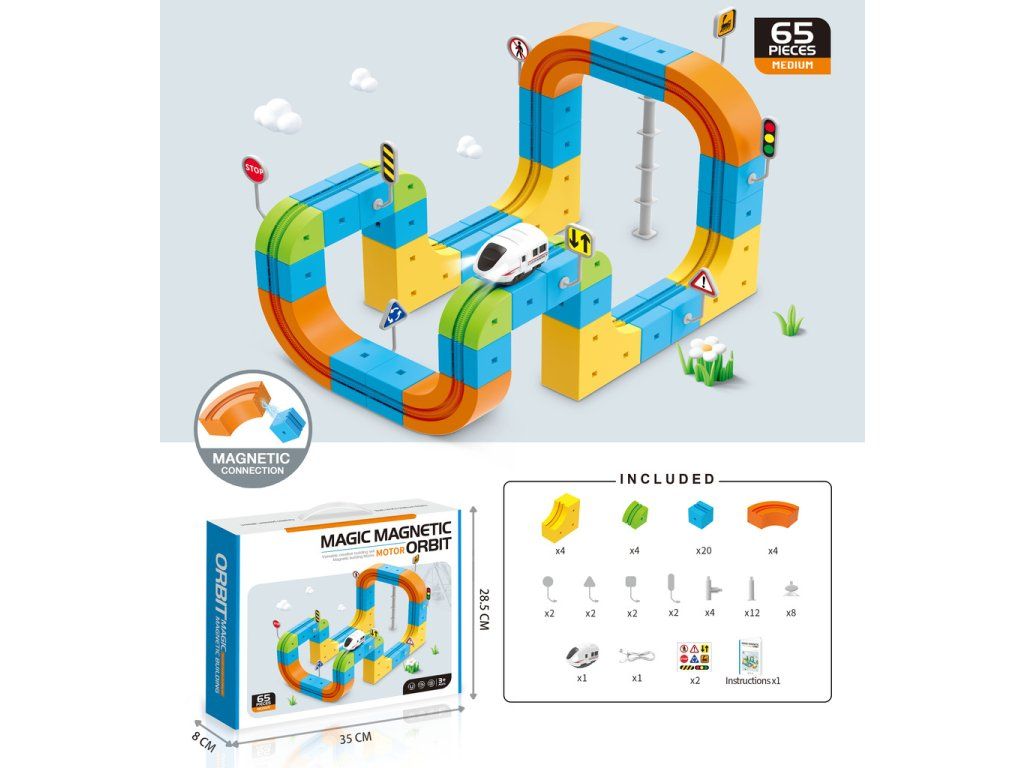Magnetické stavebné bloky 65 dielikov – pretekárska dráha, vlaky