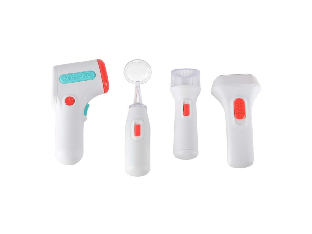 - Interaktívne prvky príslušenstva: Zubný endoskop, ultrazvukový skener a baterka svietia; teplomer a stetoskop svietia a vydávajú zvuky