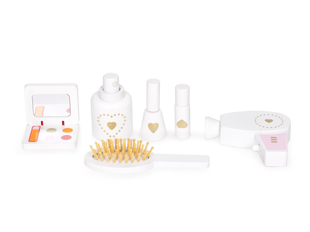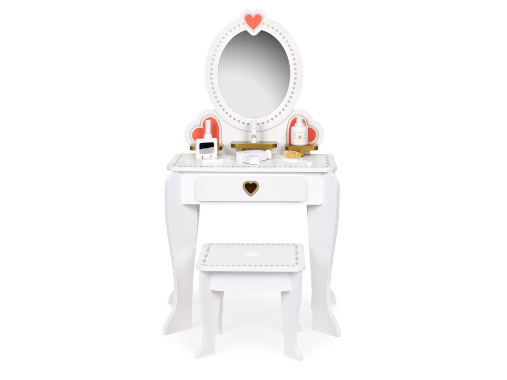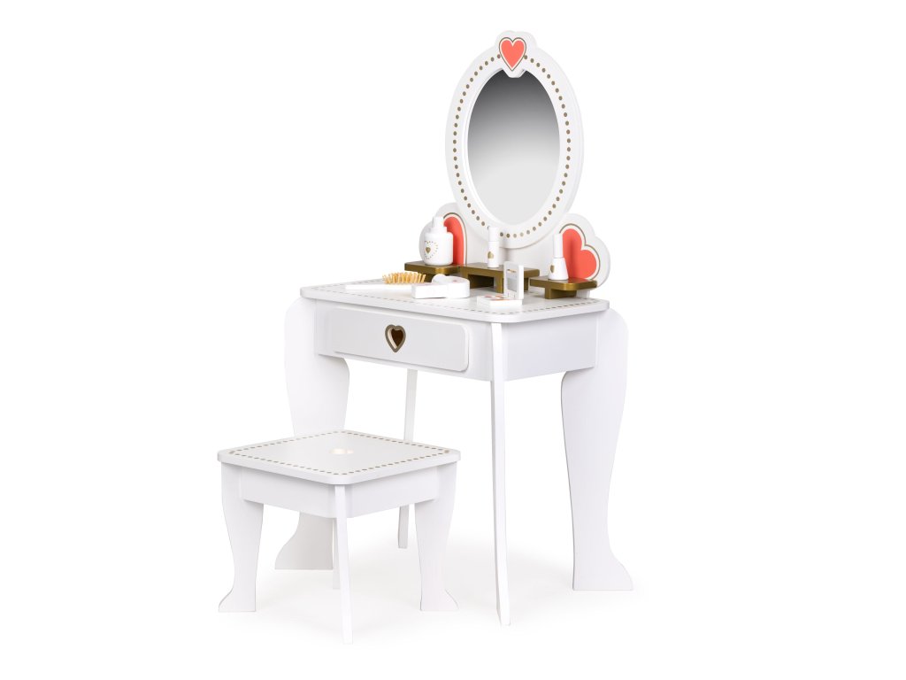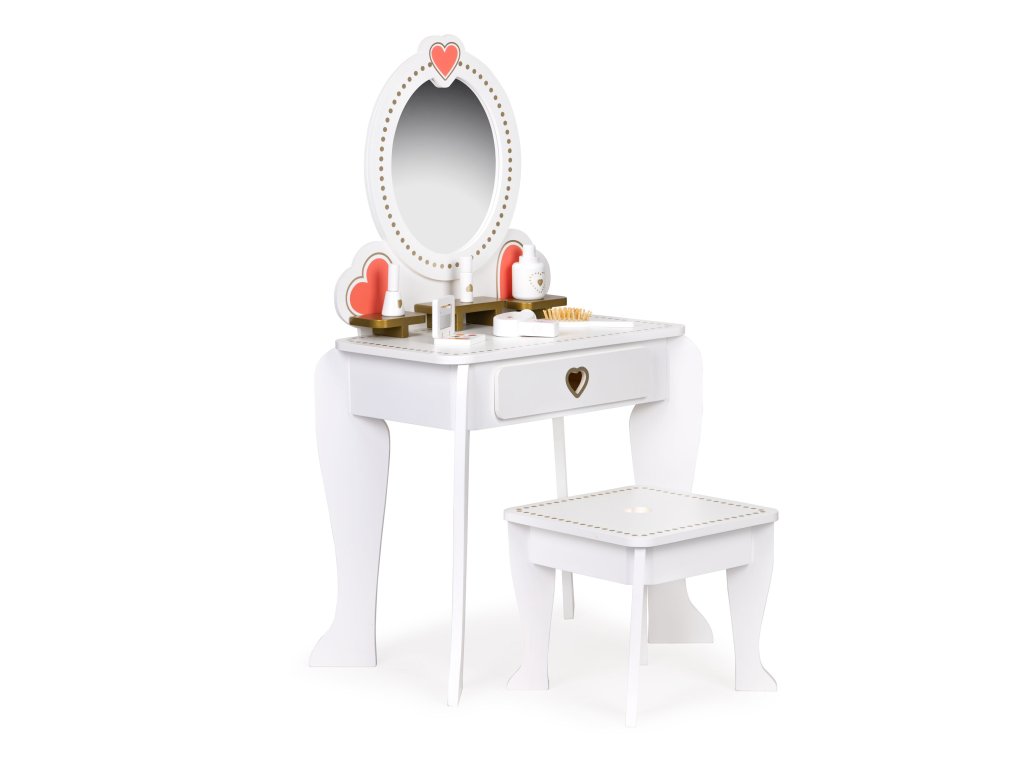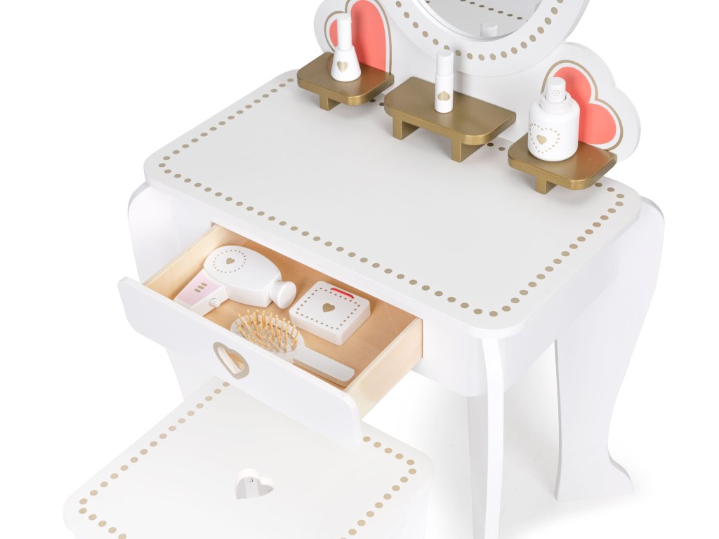 Toaletný stolík je vybavenýs doplnkami, ako je hračkársky fén, drevená kefa alebo malé zrkadlo na líčenie. Všetko príslušenstvonemajú ostré hrany, takže sú v úplne bezpečné pre deti.