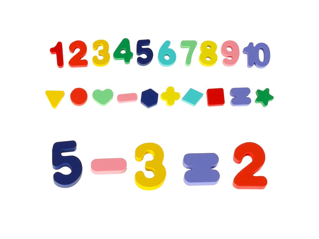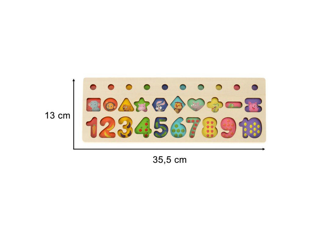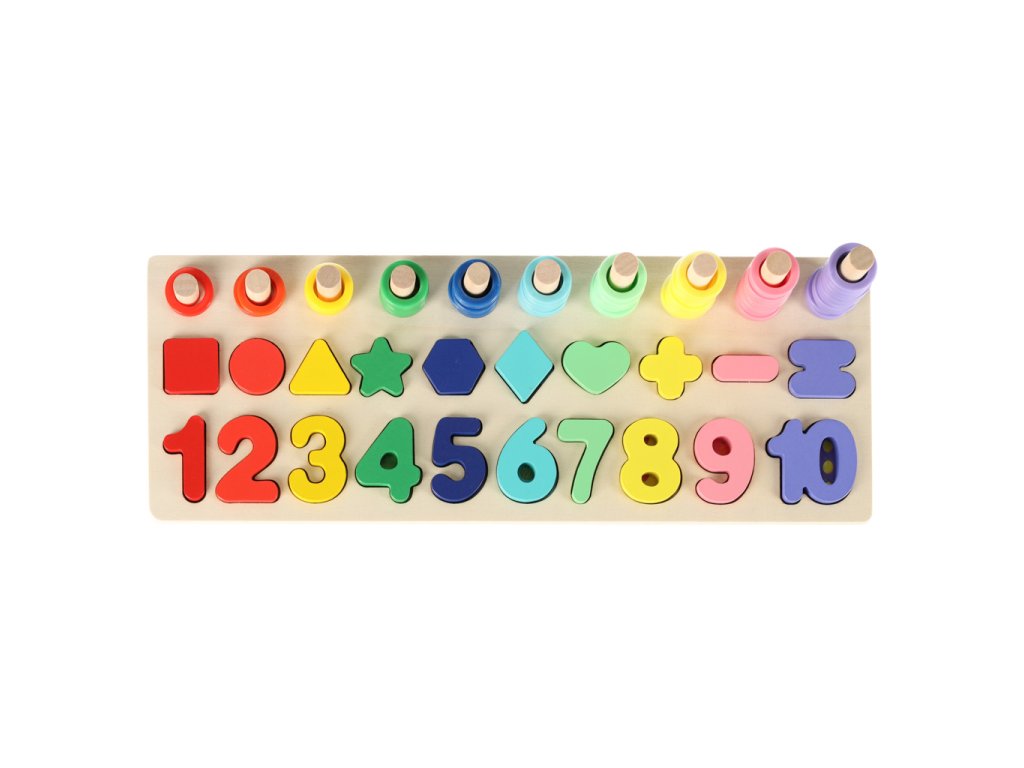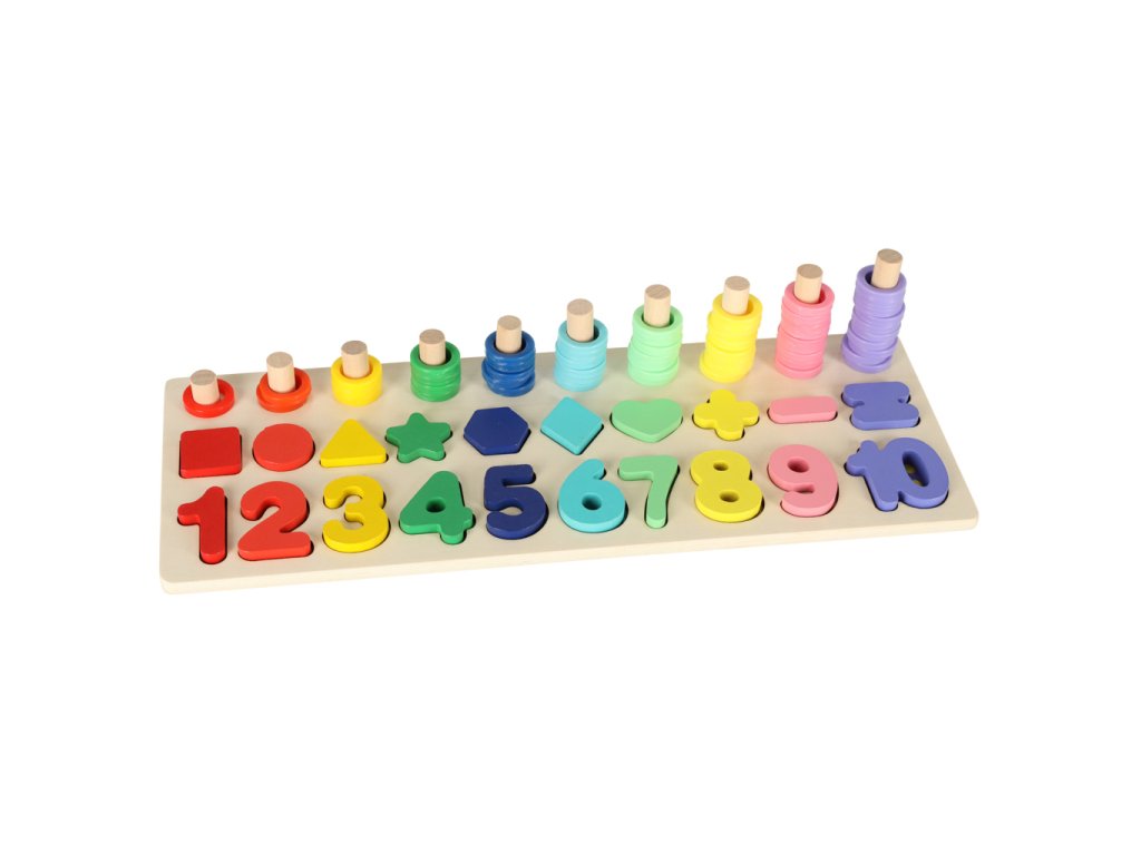 Súprava obsahuje farebné geometrické tvary a čísla, ktoré treba priradiť k správnym otvorom. Táto hra učí deti rozpoznávať tvary a pomáha im učiť sa čísla.