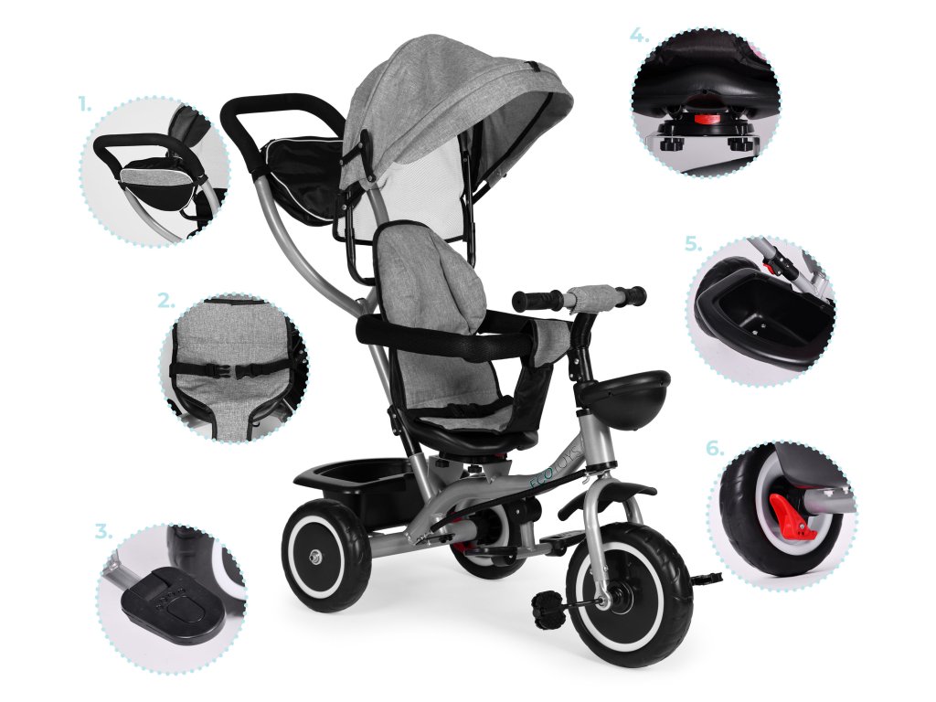 - Dá sa konfigurovať rôznymi spôsobmi - bicykel má možnosť odstrániť niektoré komponenty, napr. bezpečnostné zábradlie, striešku alebo rukoväť riadenia. Táto funkcia umožní prispôsobiť ho potrebám a schopnostiam dieťaťa.