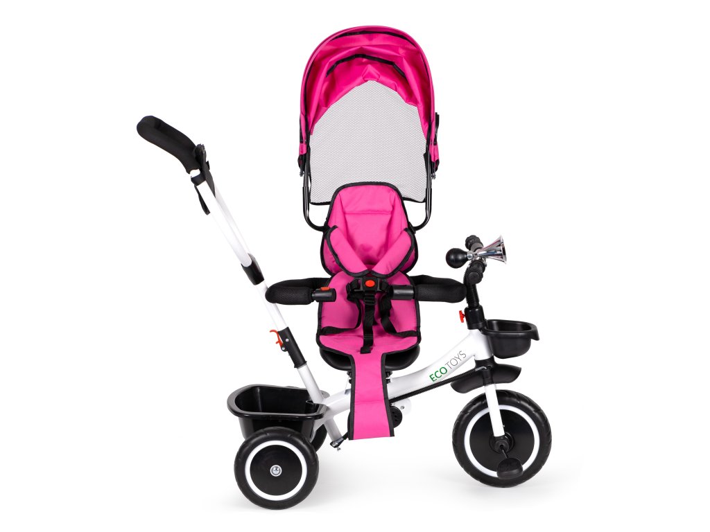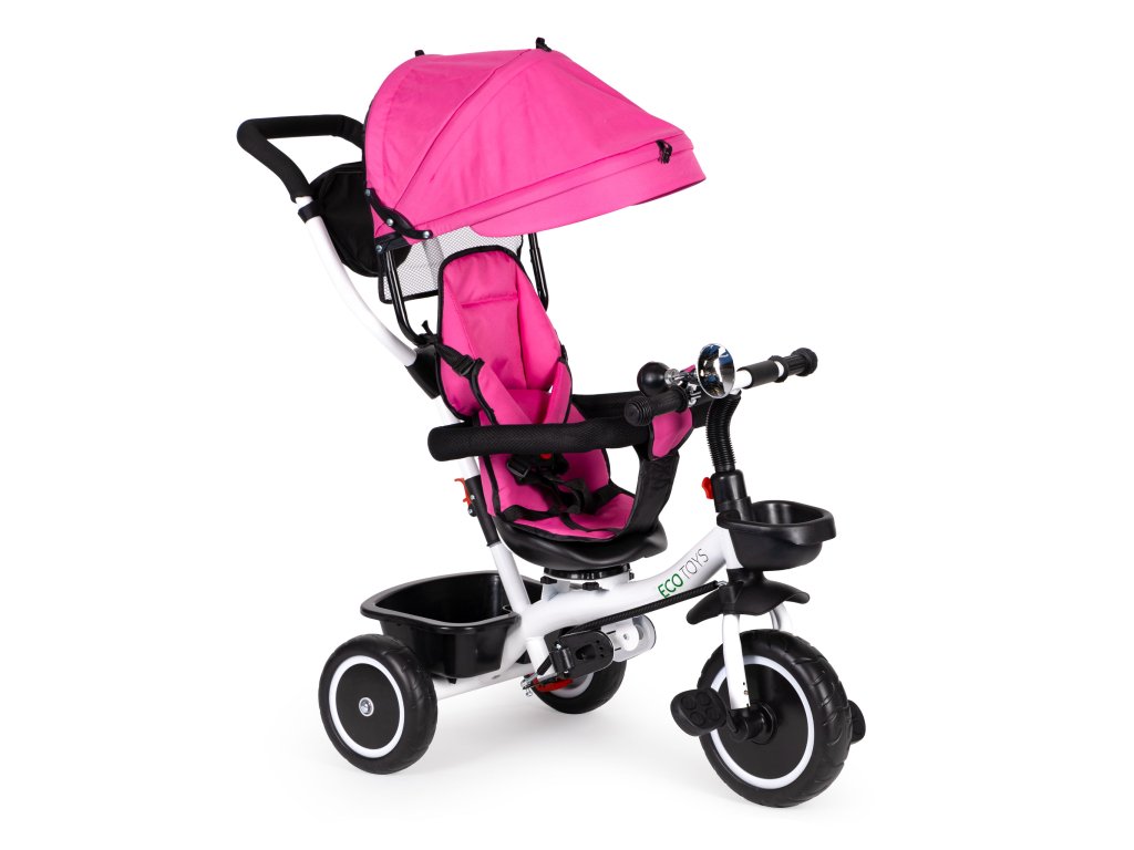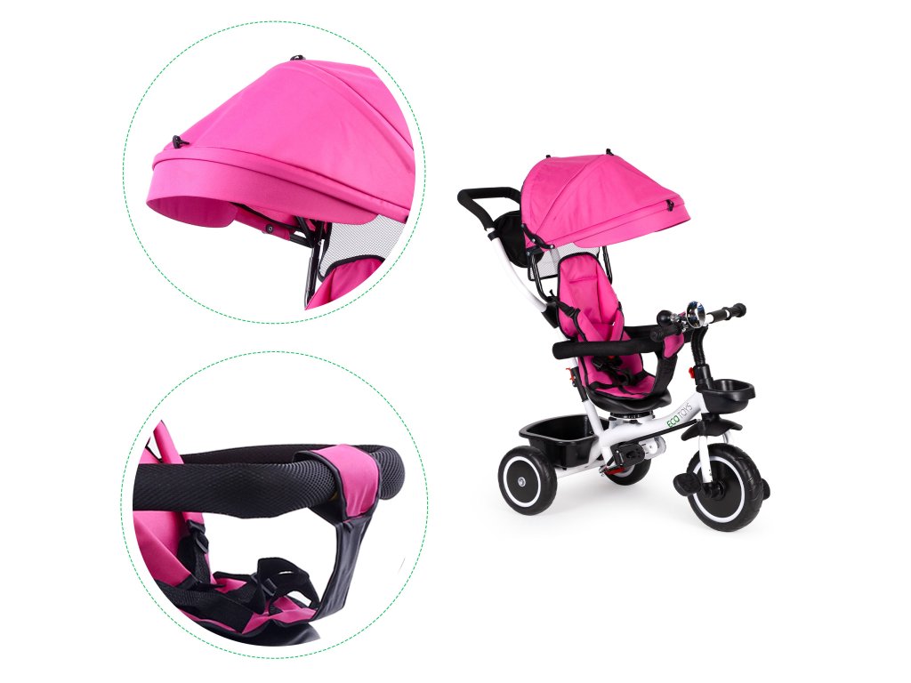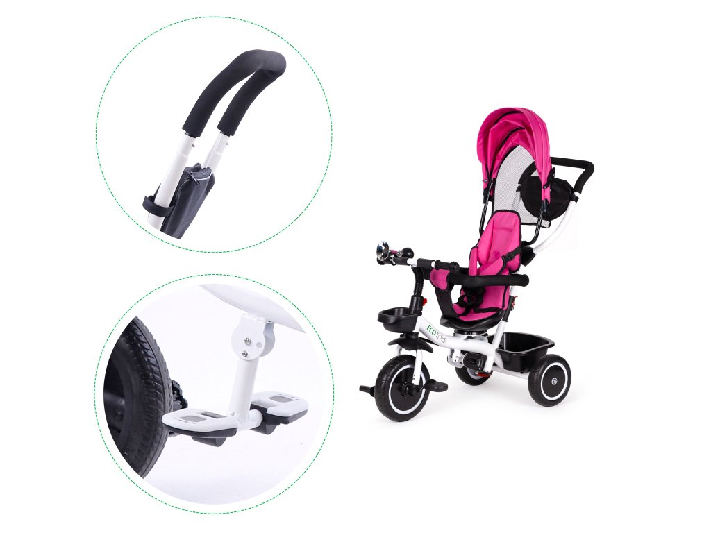 Bicykel ECOTOYS v sebe spája množstvo praktických funkcií, ktoré zabezpečia, aby vaše dieťa pohodlná a bezpečná hra. Bicykel má mäkké a pohodlné operadlo, aby batoľa pohodlne sedelo a bezpečnostné pásy a zábrany proti vypadnutiu zo sedadla. Skladacia strieška chráni pred slnkom a dažďom a špeciálne tvarované rám spolu s otočné sedadlo uľahčiť nástup najmenším deťom.